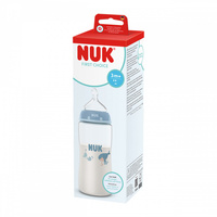 Krásná kojenecká láhev NUK First Choice s kontrolou teploty. Speciální tvar typický pro savičky NUK s ortodontickou antikolikovou savičkou je modelován podle mateřské bradavky při kojení. Ponechává dostatek prostoru pro přirozené sací pohyby jazyka i čelisti. Vylepšený systém proti polykání vzduchu při pití Anti Colic Air System zajišťuje přirozený tok mléka, aby dítě pilo uvolněně bez polykání vzduchu. Kojenecké láhve jsou nyní vybaveny novou NUK kontrolkou teploty a pomáhají tak zabránit tomu, aby vaše dítě pilo příliš horký příkrm. Kontrolka vypadá jako teploměr, je umístěna mezi ryskami a teplota obsahu láhve změní její barvu. Pokud je příkrm příliš horký, modrá kontrolka se změní na bílou. V ideálním případě by měl příkrm mít tělesnou teplotu (37 °C), což odpovídá modrému zabarvení displeje. Vyrobena z vysoce kvalitního nerozbitného plastu polypropylenu a neobsahuje BPA (Bisfenol A). Obsah láhve 300 ml. Vhodná pro děti od 3 měsíců M (středně velký otvor = pro dětskou výživu). Klinicky testováno.