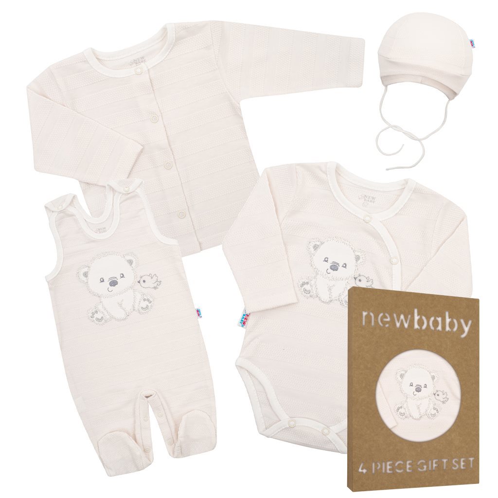 Roztomilá kojenecká 4-dílná soupravička české značky New Baby Sweet Bear pro miminka. Soupravička je vyrobena z velmi příjemňoučkého, měkkého a kvalitního materiálu, který je vhodný pro miminka a je vhodná nejen do porodnice. Obsahuje celorozepínací body s dlouhým rukávkem, dupačky, kabátek a čepičku. Celorozepínací body zdobí vyšitý obrázek medvídka a ptáčka. Dupačky zdobí roztomilý obrázek medvídka a ptáčka. Zapínání na cvočky na ramínkách a mezi nožičkami usnadní oblékání a přebalování. Kabátek je jednobarevný s krásným lemováním okolo ručiček. Zapínání je na cvočky po celé délce. Čepička je krásně tvarovaná na ouška a zavazuje se na tkaničky, díky čemuž dobře drží na hlavičce miminka a nepadá. Je velmi praktická a netlačí na hlavičku miminka. Celá soupravička má nový neobyčejný design s atraktivním vzorem látky. V této soupravičce, která je precizně a kvalitně ušitá se bude miminko cítit velmi příjemně. Je navržena s ohledem na potřeby miminka a je vhodná i jako milý dáreček. Soupravička je v praktické Eko krabičce. Složení: 100% bavlna.