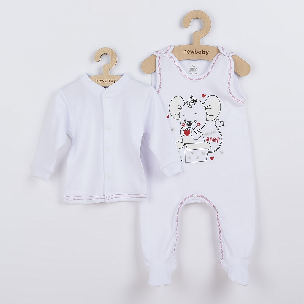 Nápaditá bavlněná kojenecká soupravička New Baby Mouse pro miminka. Součástí soupravičky jsou dupačky a kabátek. Kabátek je jednobarevný. Zapínání na cvočky po celé délce usnadňuje oblékání. Dupačky jsou zdobené barevným lemováním a velkým obrázkem myšky. Zapínání na cvočky na ramínku a mezi nožičkami usnadňuje oblékání a přebalování. Soupravička má velice příjemňoučký a kvalitní materiál, který je ideální pro miminka. Pro New Baby je velmi důležitá spokojenost zákazníka a právě proto vám nabízíme naši novou kvalitní kolekci Mouse. Mouse je nová dechberoucí kolekce od New Baby. Složení: 100% bavlna. Produkt české značky.