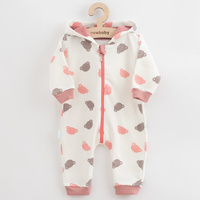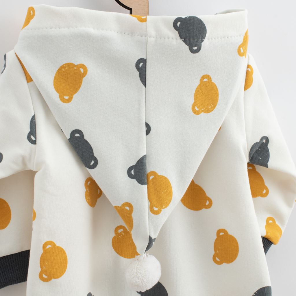 Roztomilý a praktický overal s kapucí české značky New Baby Little One. Overálek je celopotištěný medvídky, má zapínání na zip po celé délce a pružné lemy na rukávcích a nohavičkách. Kapuce je podšitá barevnou podšívkou a je zdobena roztomilou bambulkou. Overal je vyroben z pohodlné teplákoviny. Vhodný pro celoroční nošení. Materiál: 96% bavlna, 4% elastan.