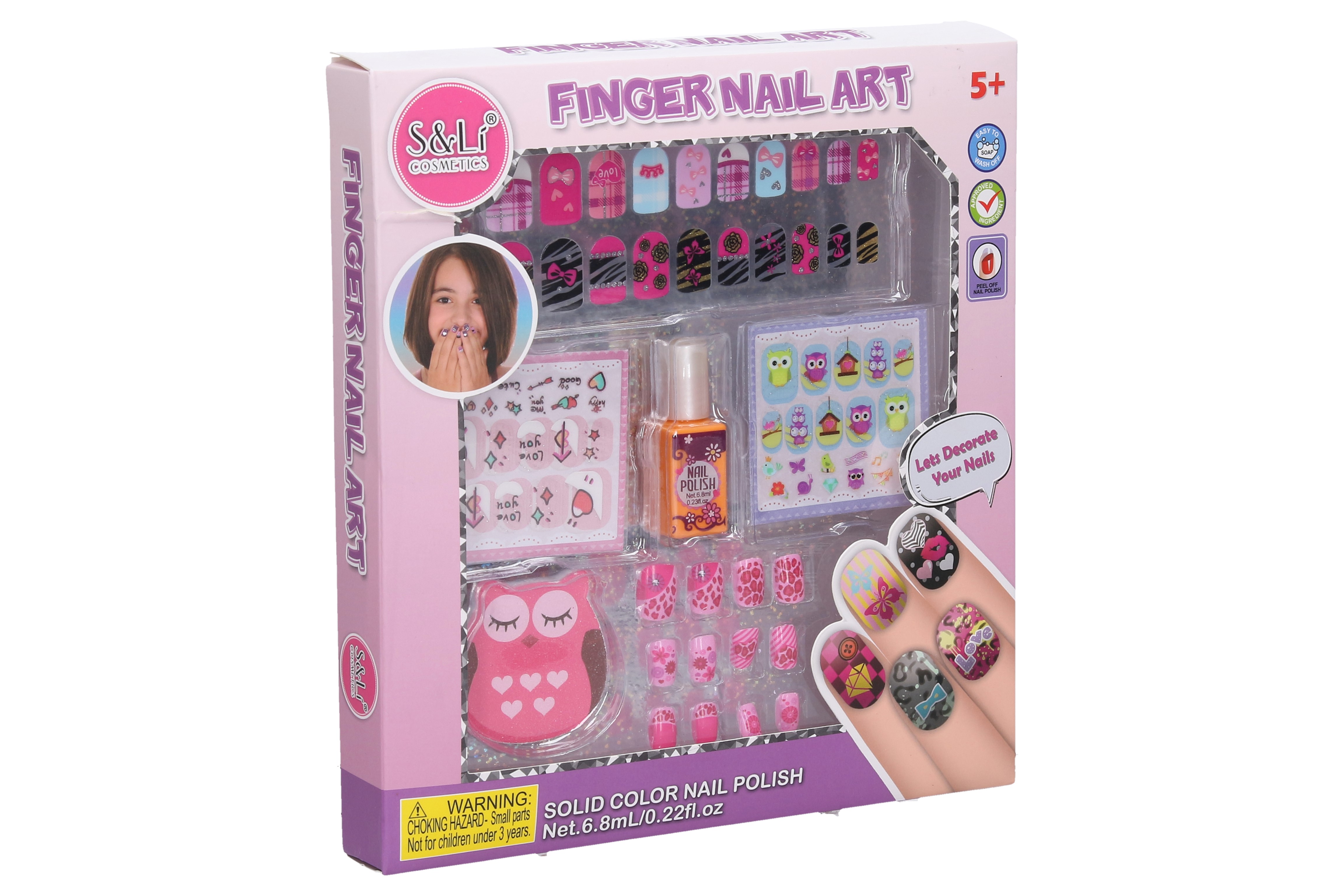 Kosmetický set péče o nehty. Obsahuje nalepovací nehty, lak na nehty, pilník, nálepky na nehty, lak na nehty.