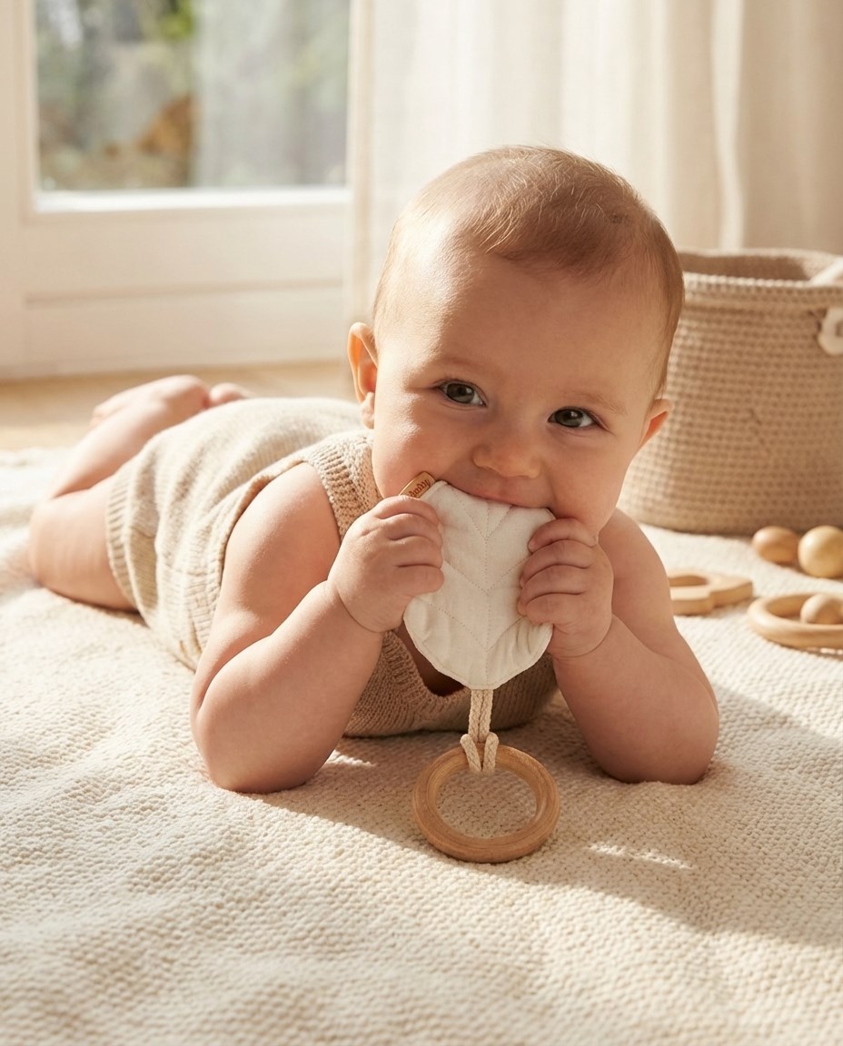 Kousátko s mušelínovou plenou je ideální sada, když se dítěti prořezávají zoubky. Kousátko je vyrobeno z bukového dřeva šetrného ke středu a měkké mušelínové látky. Zcela bezpečné pro děti přináší uklidňující úlevu při prořezávání zoubků. Kousátko lze použít také jako hračku pro miminka. Kousátko se dokonale hodí k našim dalším mušelínovým výrobkům a vytváří tak krásnou sadu, kterou lze darovat na dětskou oslavu.