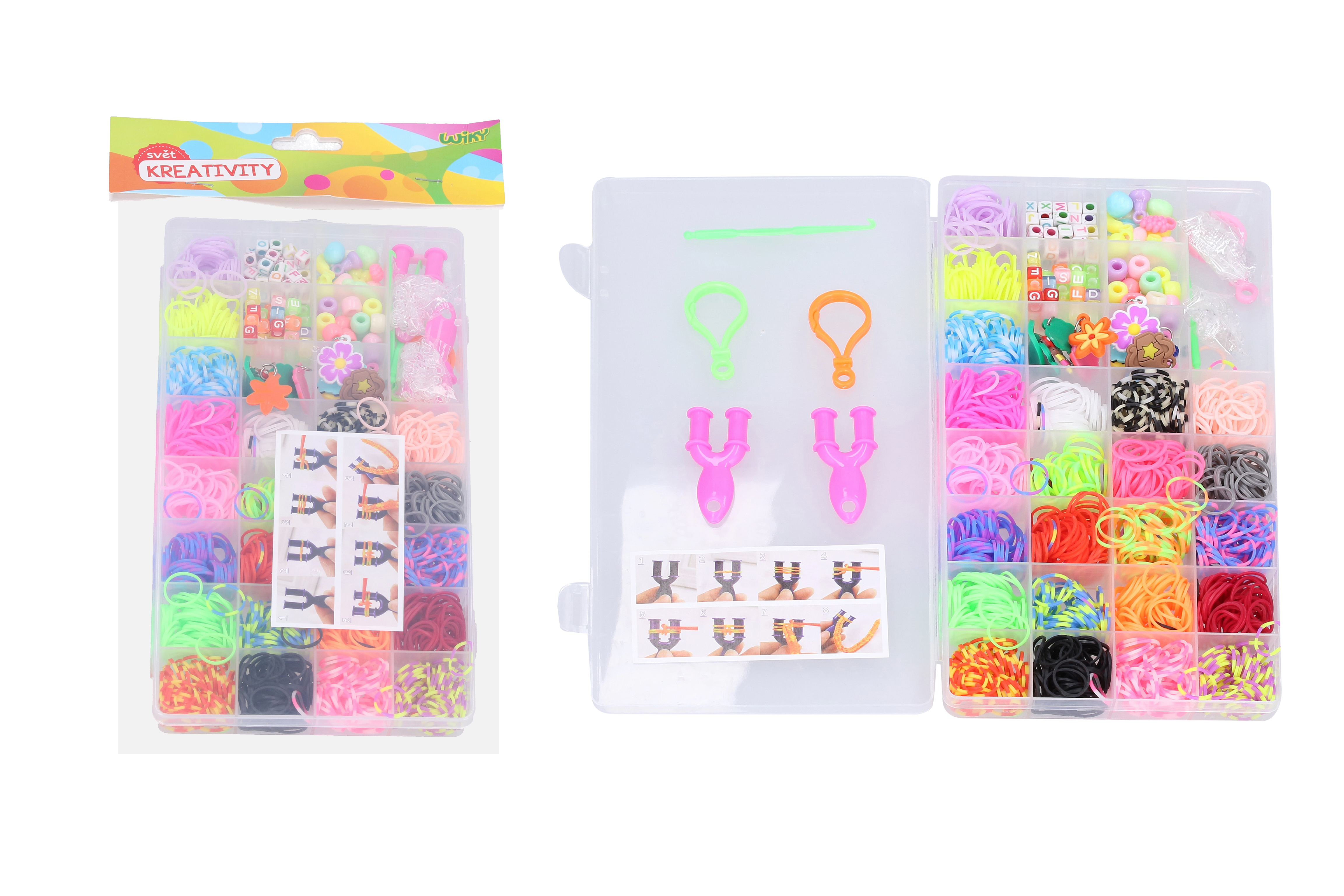 Balení obsahuje: korálky, zaplétací gumičky, příslušenství, ozdoby a návod.