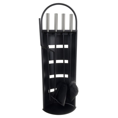 Sada 5v1 – balení obsahuje všechny nástroje potřebné k obsluze krbů a jiných ohnišť: kleště, lopatku, smetáček a pohrabáč. Vše je úhledně uloženo na kovovém stojanu.