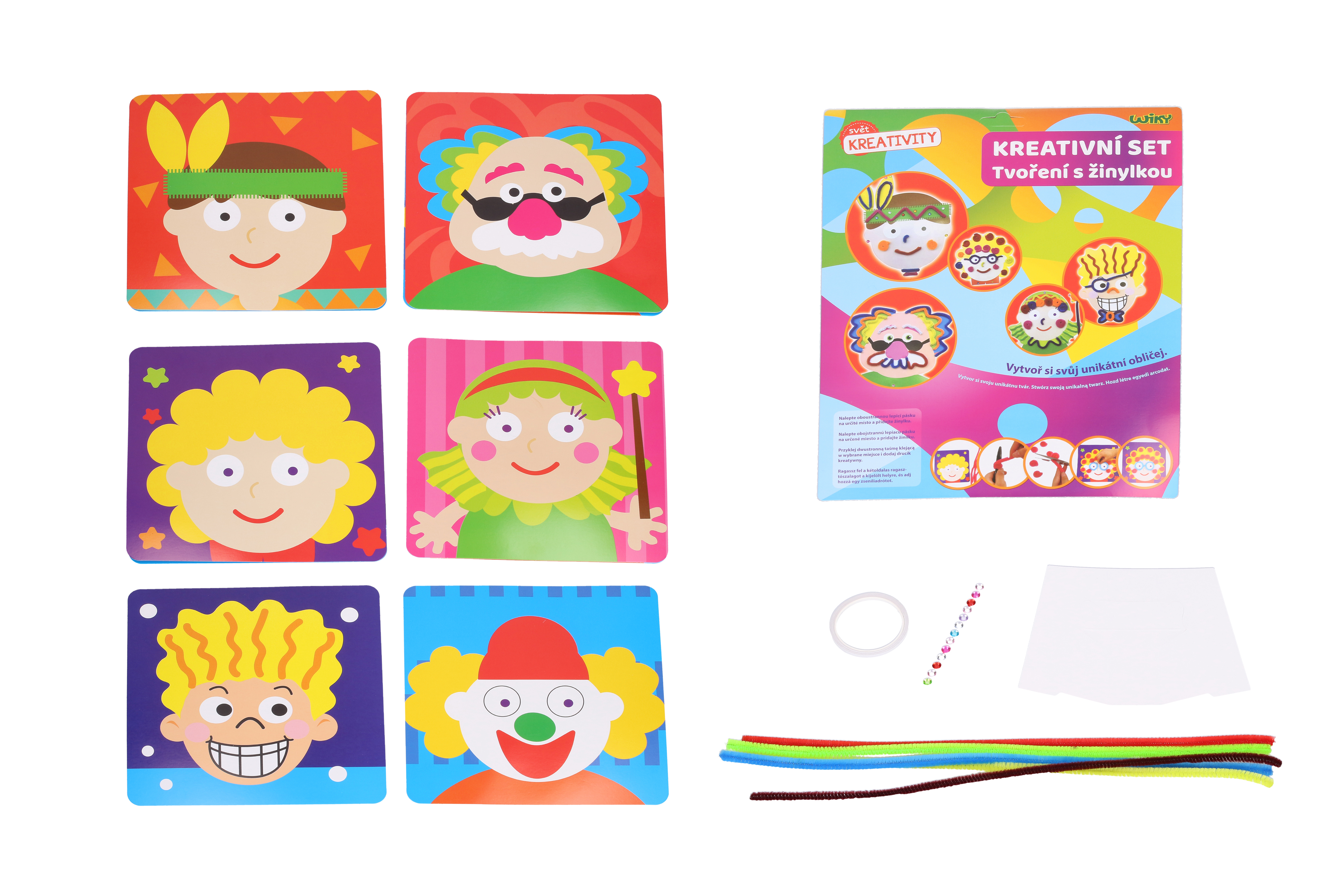 Balení obsahuje: Žinylky, kamínky, 1x obličej, oboustrannou lepicí pásku a stojánek.