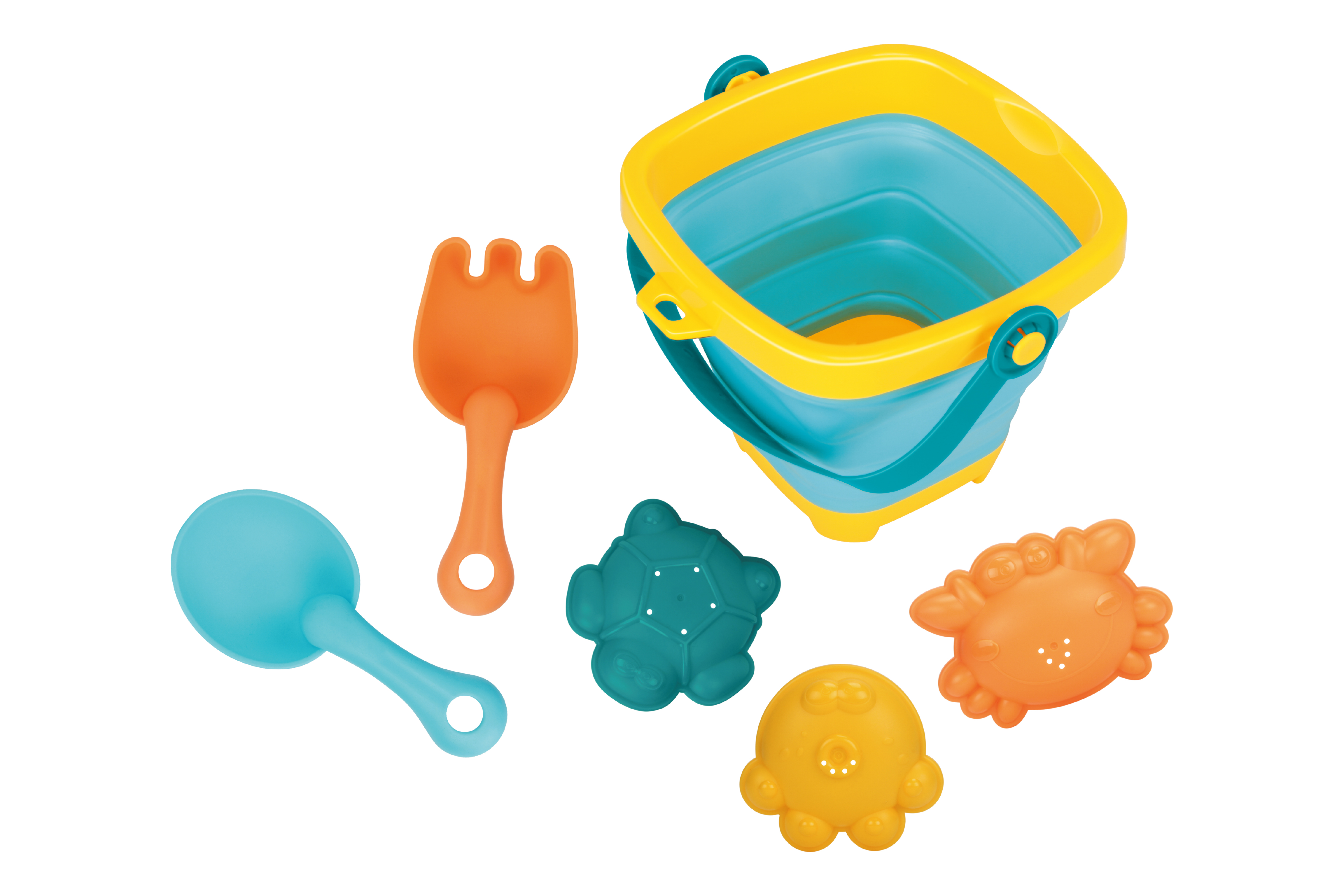 Kyblík skládací do vany nebo na písek. Obsah balení - skládací kyblík 19x18 cm, 3 formičky - želva, krab, žába, hrabičky a lopatka.