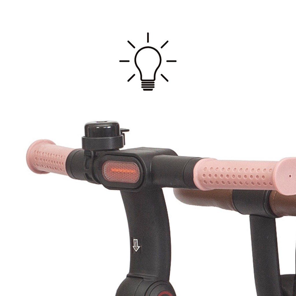 Twinkle je vybavena nastavitelnou rukojetí, funkcí volnoběhu, brzdou, bezpečnostními pásy s chrániči a pohodlným třípolohovým opěradlem a zaručuje úplnou kontrolu a pohodlí pro dítě i rodiče. Její lehký, ale odolný ocelový rám, kola s pěnovou výplní a kuličkovými ložisky, skládací konstrukce a praktické prvky, jako je síťovaná stříška, LED světlo, držák na nápoje a dva úložné boxy, z ní činí perfektní volbu pro každou příležitost – ve městě, na procházce nebo na výletě. Po odstranění rukojeti, kolejnic a stříšky lze Twinkle používat jako klasickou tříkolku.