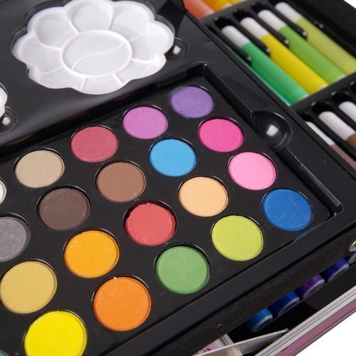 POŘÁDEK MUSÍ BÝT – po otevření kufříku najdete umělecké potřeby úhledně uspořádané v jednotlivých přihrádkách. Sada obsahuje fixy, pastelky, vodové a akrylové barvy v sytých barvách.