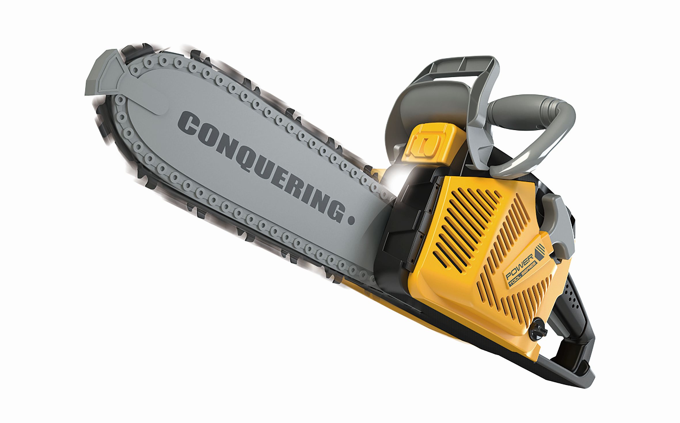 Motorová pila. Rozměry 43x10x18,5 cm. Světelné a zvukové efekty. 3xAAA baterie nejsou součástí. Nastartování povytažením startovacího kabelu.