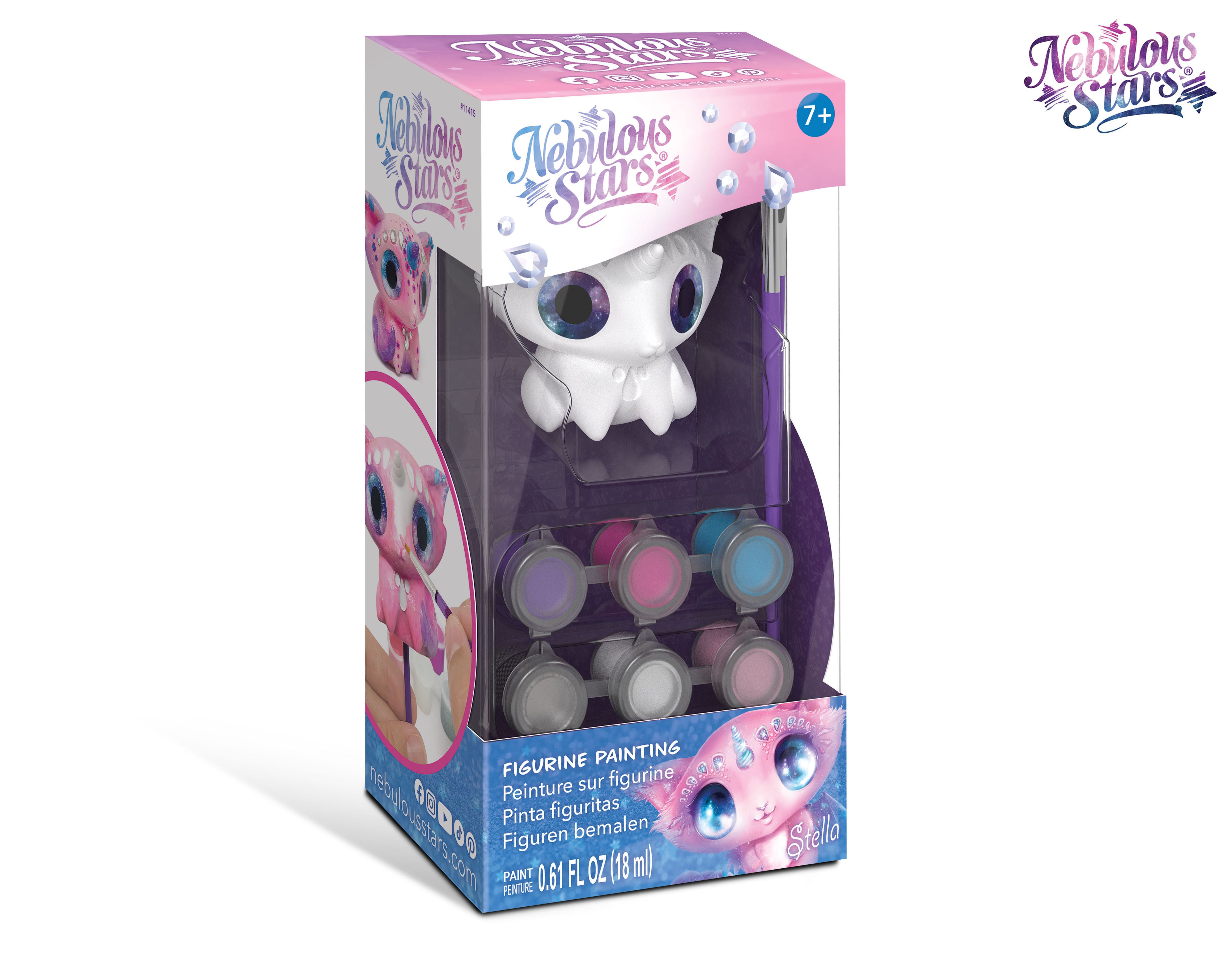 Nebulous Stars Barvení figurky. Velikost figurky 8 cm. Obsah - figurka, 5 barev, třpytivý lak, kamínky, 2 štětce, hůlka, návod. 6 variant.