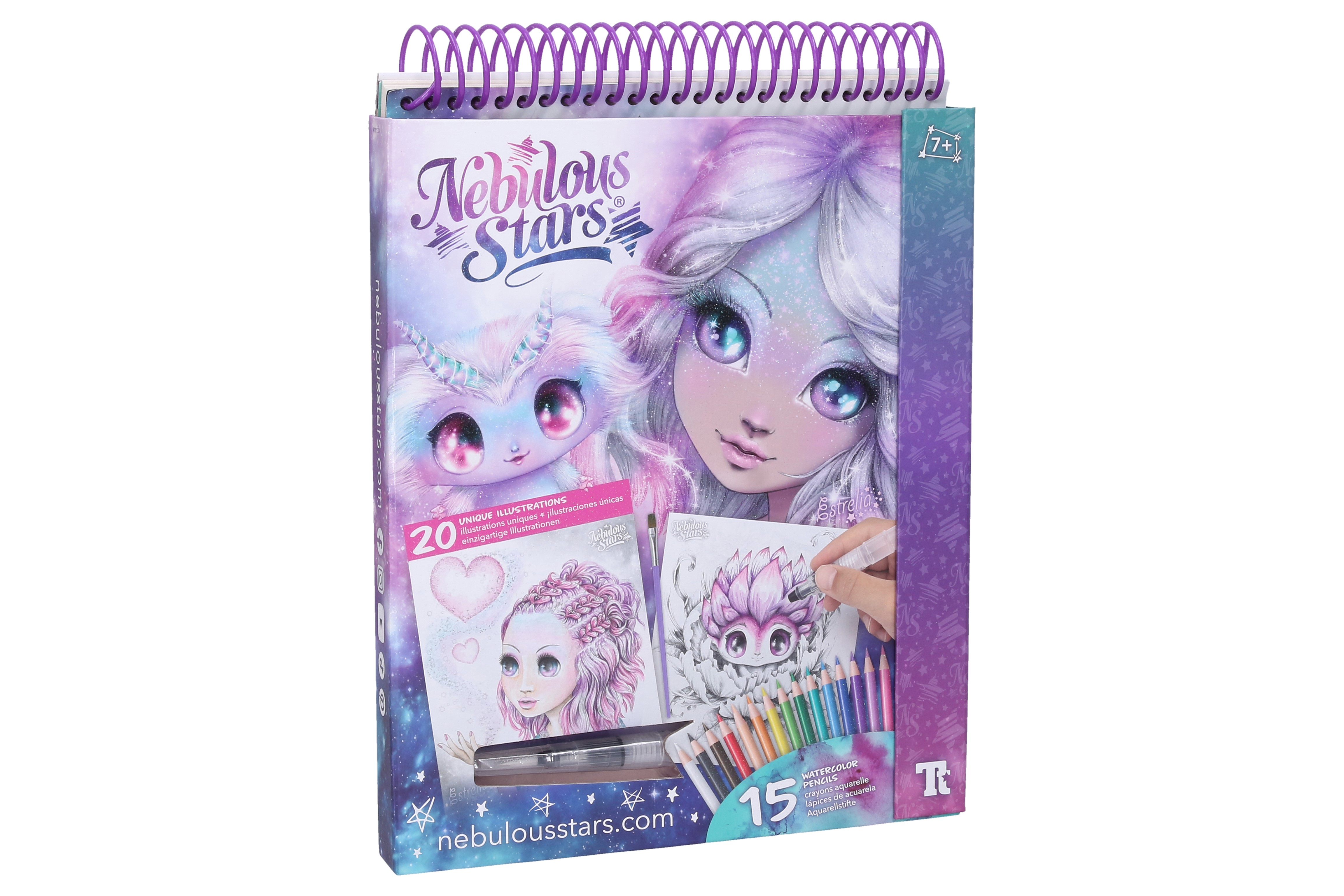 Nebulous Stars omalovánky. Pro vodové fixy. Obsah balení - 20 ručně kreslených ilustrací, 15 vodových fixů, doplnitelný štětec pro vodové barvy, štětec, příběh, návod. Display box 6 ks.