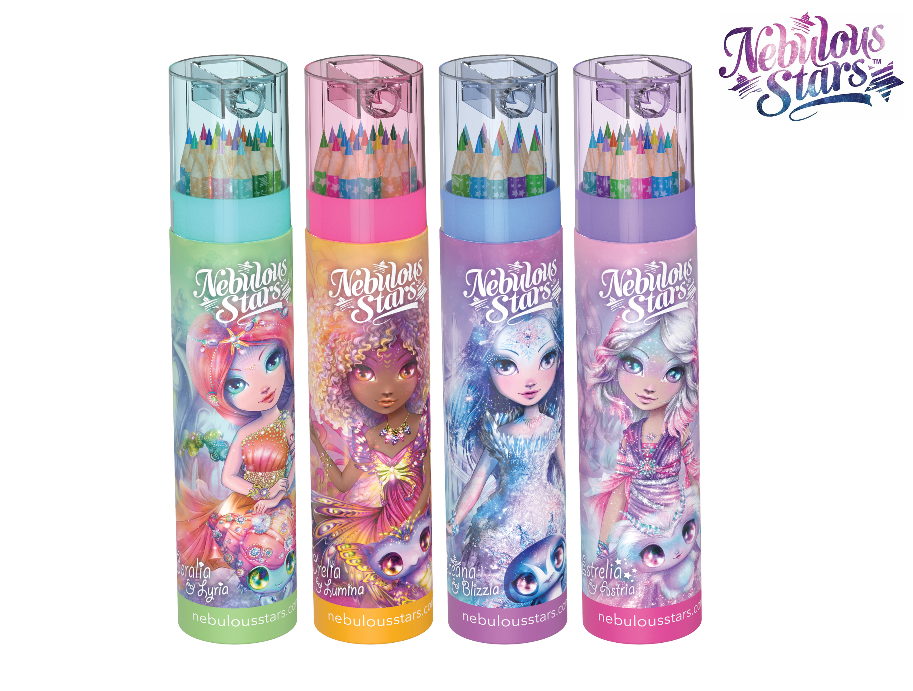 obsahuje 18 barevných pastelek, 1x Nebulous Star tužku, integrované ořezávátko, assort: fialová, zelená, růžová, modrá, display box 16 ks