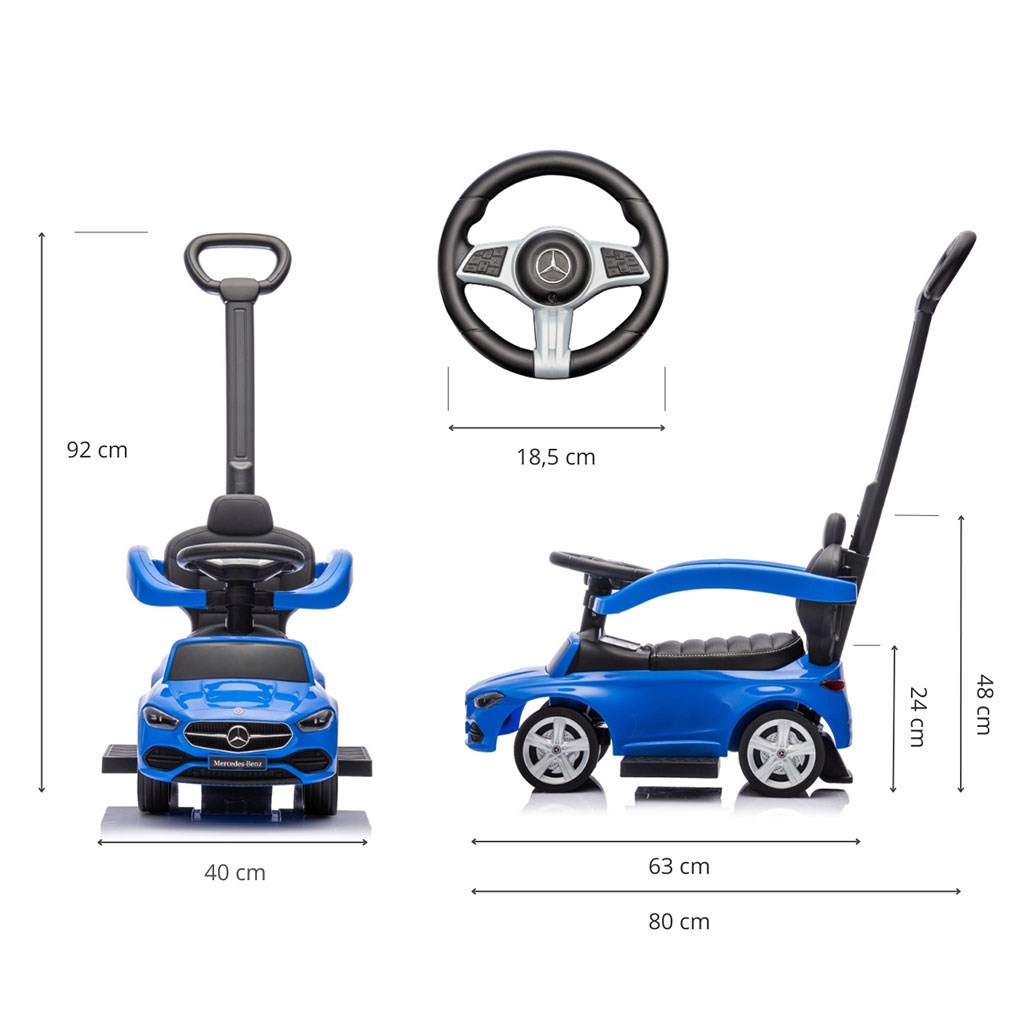 Realistický design inspirovaný modelem Mercedes C-Class zaujme detaily jako elegantní provedení, gumová kola, logo značky, volant se zvuky a "přístroje," což podporuje dětskou představivost a umožňuje kreativní hru.