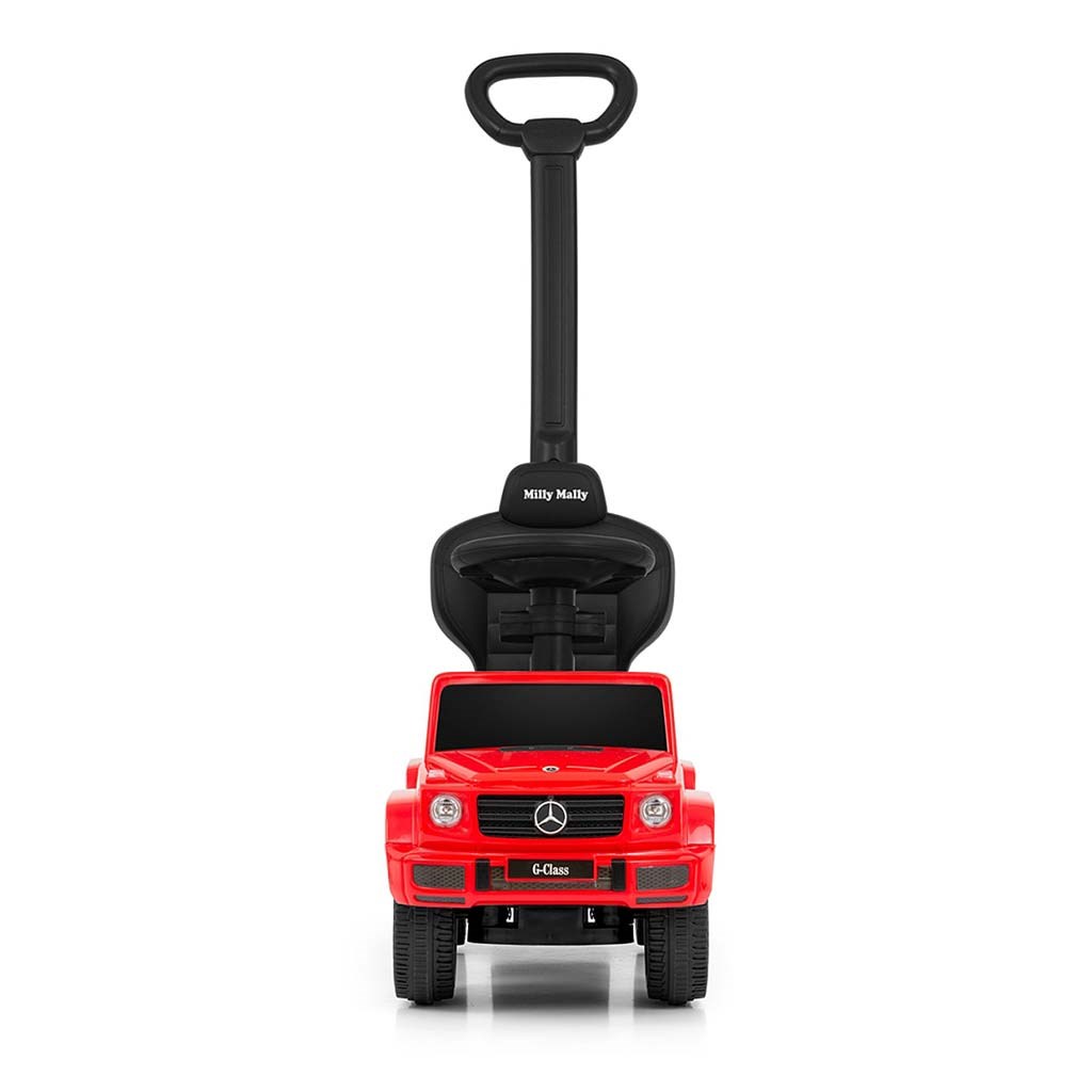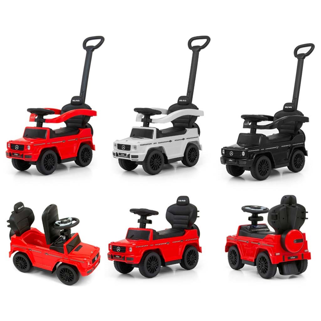 Dětské odrážedlo s vodící tyčí MERCEDES G350d je vyrobeno v licenci koncernu MERCEDES. Váš malý závodník či závodnice se v něm bude cítit jako v opravdovém džípu. Odrážedlo je vyrobeno s důrazem na každý detail a kvalitu použitých materiálů. Jeho vzhled upoutá pozornost nejen každého dítěte, ale i rodiče. Odrážedlo pomáhá rozvíjet motorické schopnosti dítěte a Váš malý závodník či závodnice si s ním užije spoustu zábavy a legrace. Autíčko má na tříramenném volantu tlačítka vydávající různé melodie, zvuk motoru nebo houkačku. Je určeno jak pro nejmenší děti, které už umí sedět, tak i pro děti, které se už naučily chodit. Odrážedlo má otočná přední kola, široké a komfortní sedadlo s úložným prostorem a pohodlnou a zároveň pevnou vodící tyč, kterou lze odrážedlo řídit. Vodící tyč, opěrky na ruce a podnožky lze sundat a tím dítě využije autíčko jako klasické odrážedlo. Baterie nejsou součástí balení (2x AA 1.5V).