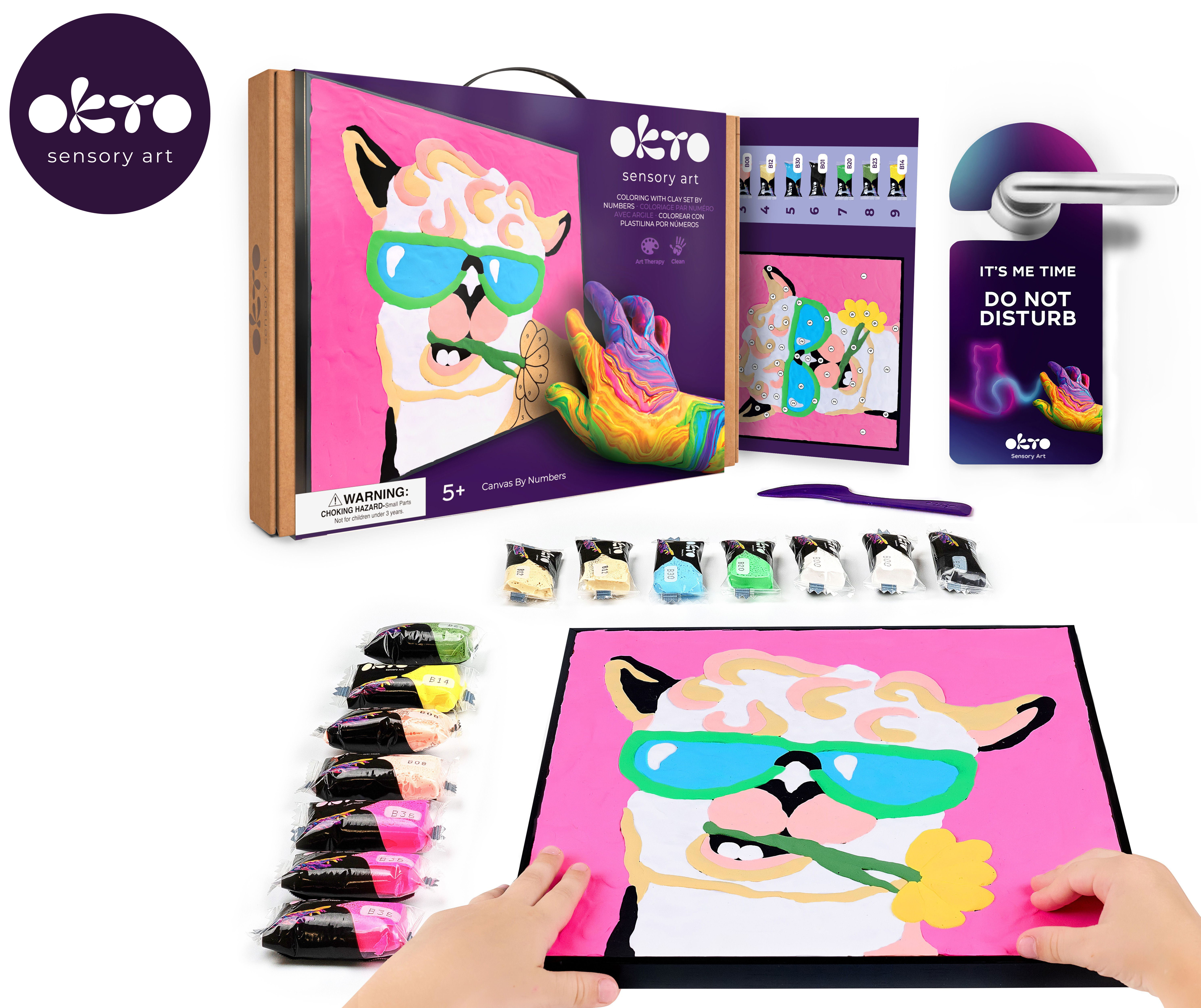 OKTO Malování hmotou podle čísel "Lama". Velikost plátna 29x29 cm. Obsah balení - plátno, obrázkový návod, modelovací nástroj, sada barevých tvarovacích směsí 14 ks.
