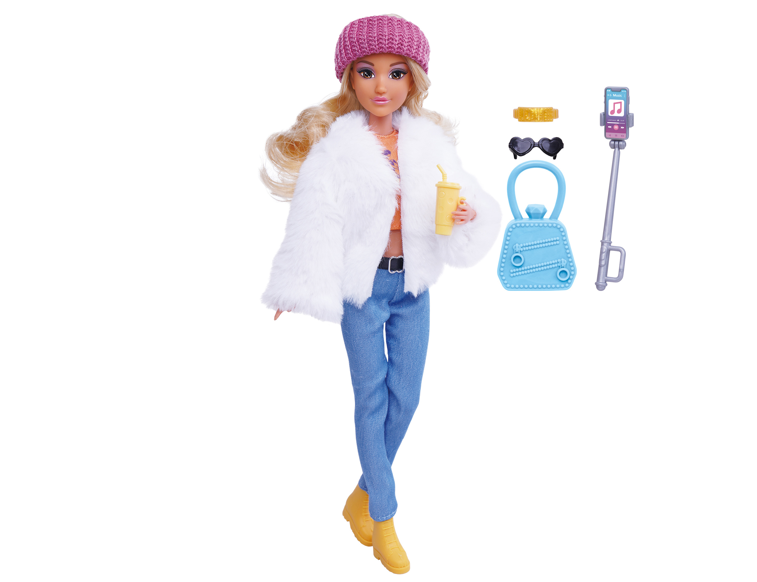 Panenka s doplňky. Velikost 28 cm. Obsah balení - panenka, sluneční brýle, kabelka, mobil se selfie tyčí, kelímek.