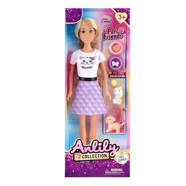 Panenka s příslušenstvím. Velikost 30 cm. Součástí pejsek, kočka, misky se žrádlem.