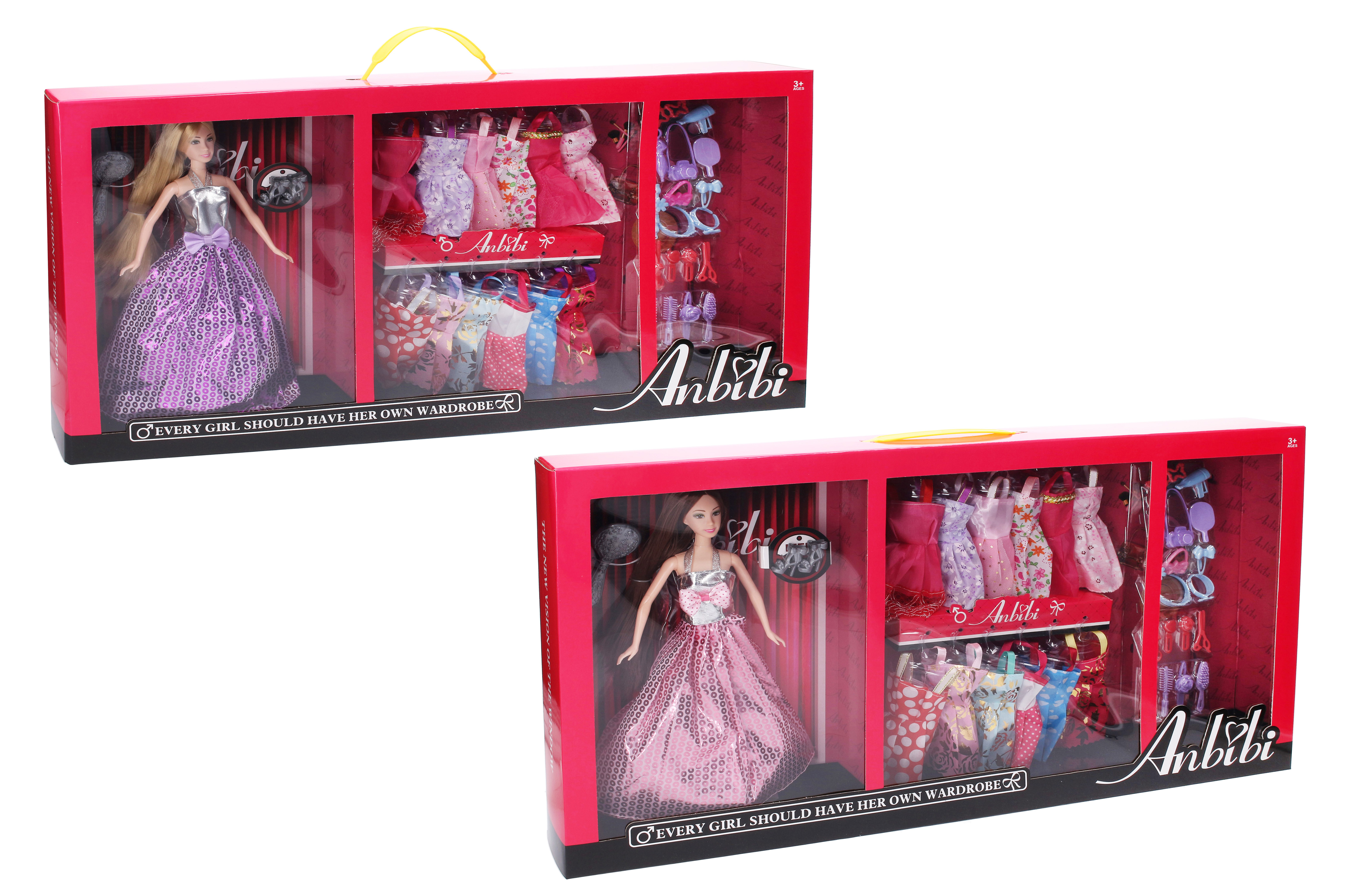 Panenka s šatníkem. Velikost panenky 30 cm. Obsah balení - panenka, hřeben, kartáč, šatník, boty, 12 druhů šatů, množství módních doplňků. 2 varianty - bruneta, blondýna.
