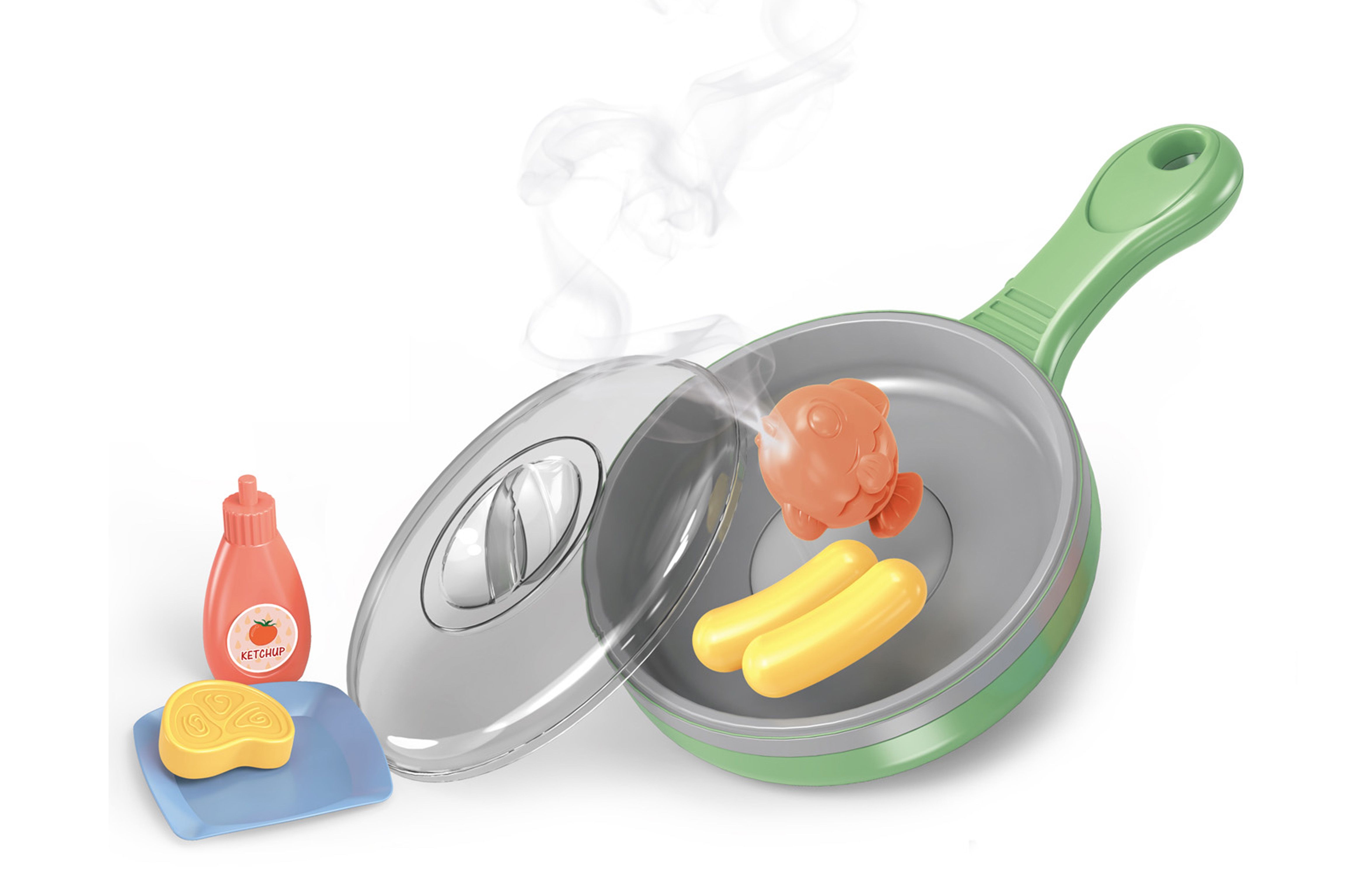 Pánev elektronická. Velikost 27 cm. Během smažení potraviny mění barvu. Obsahuje pánev, pokličku, talířek, kečup, 4ks potravin. 2xAAA baterie nejsou součástí.