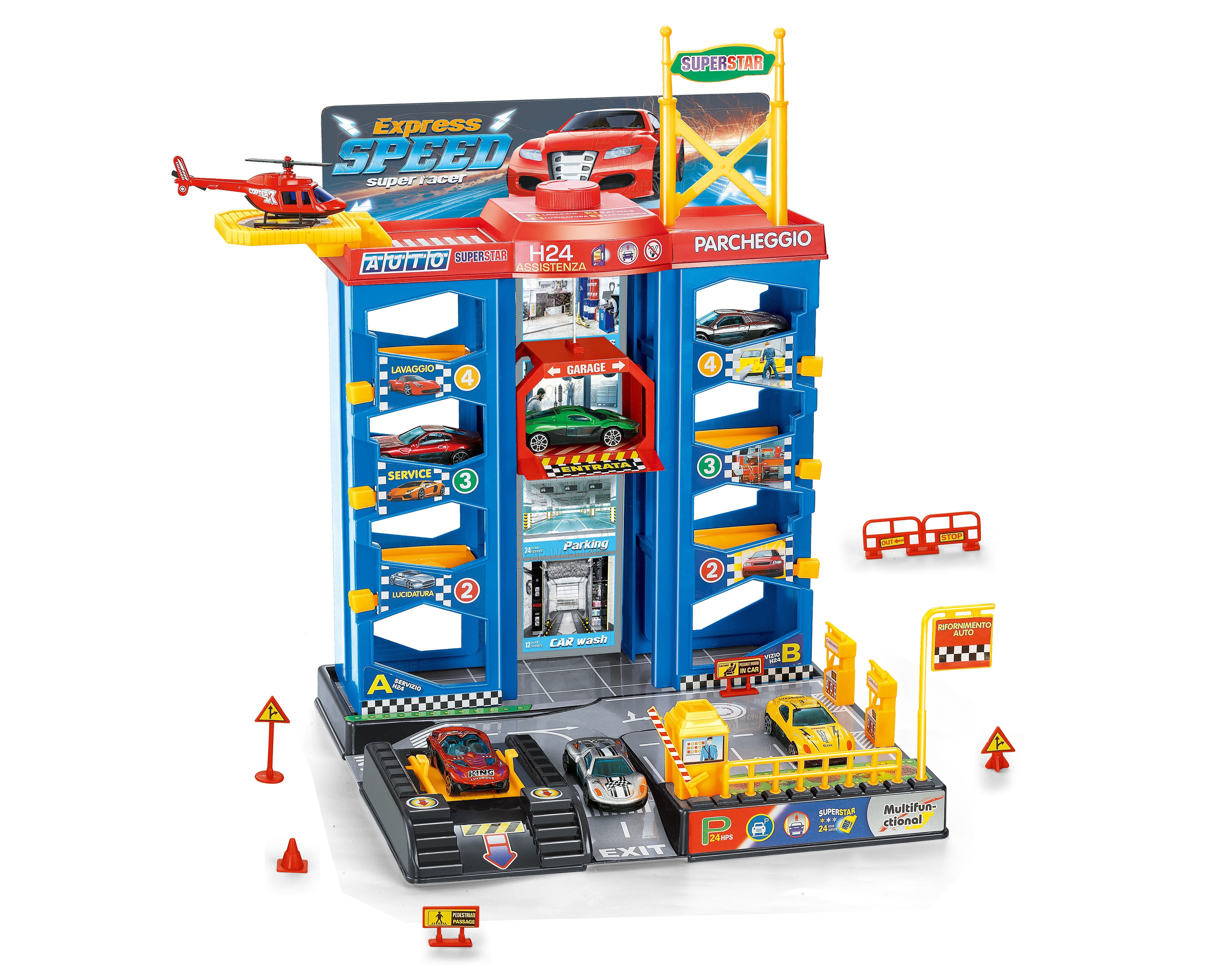 Parkovací stanice se 3 kovovými auty a vrtulníkem. Rozměry 30x27x37 cm. Velikost auta 7 cm. Stanice obsahuje 3 kovová auta, 1 kovový vrtulník, ruční výtah, heliport, čerpací stanici, závoru. Posunutím páčky v daném parkovacím místě - uvolnění auta z parkovacího místa.