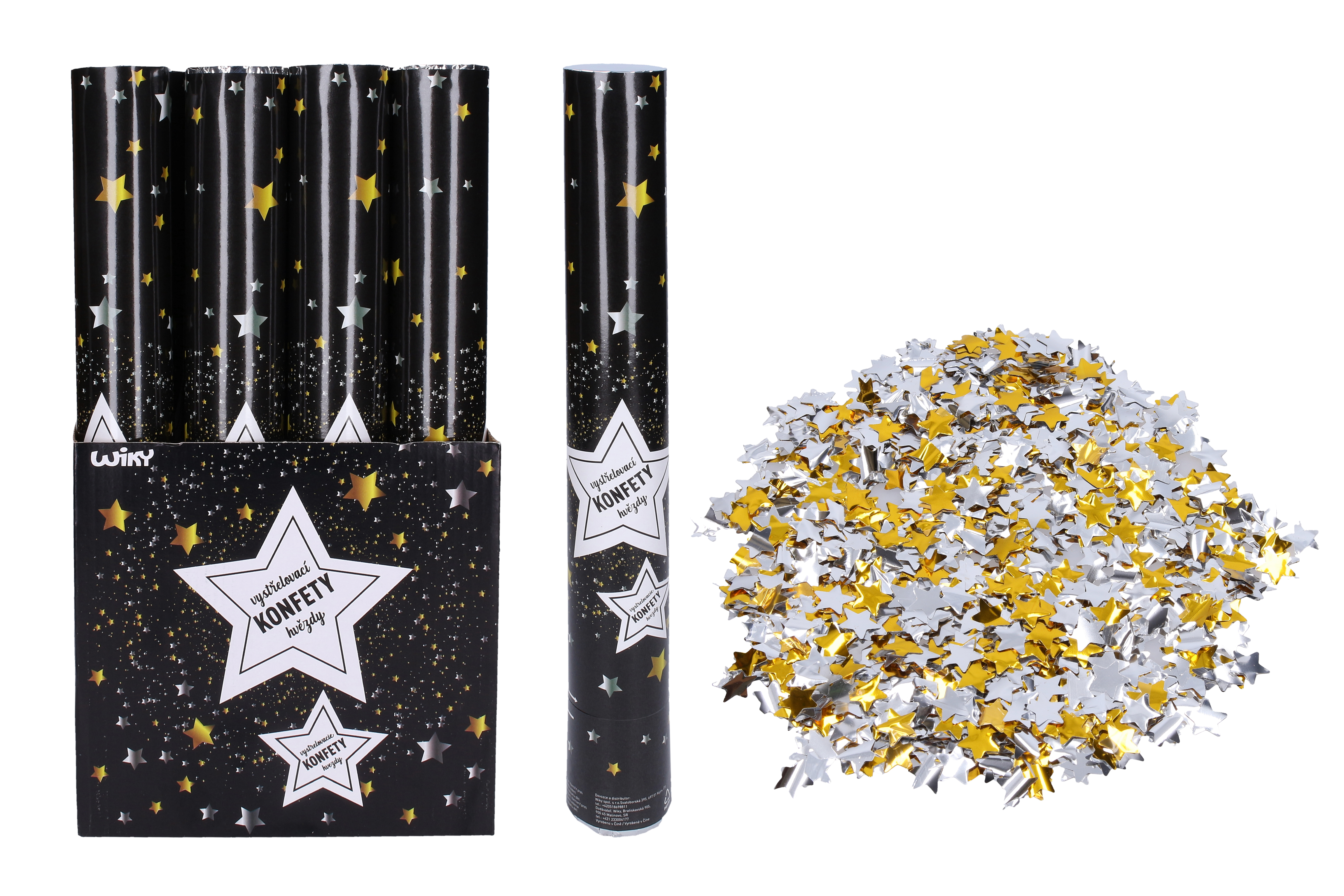 Wiky, Párty konfety vystřelovací Hvězdy 40 cm. Balení: 12 ks v display boxu. Dodržujte prosím všech instrukcí na etiketě. Nenechávejte děti bez dozoru, nemiřte do obličej, na tělo ani zvířata. Rozměry: 38 x 5 cm 16g stříbrných a zlatých hvězdiček