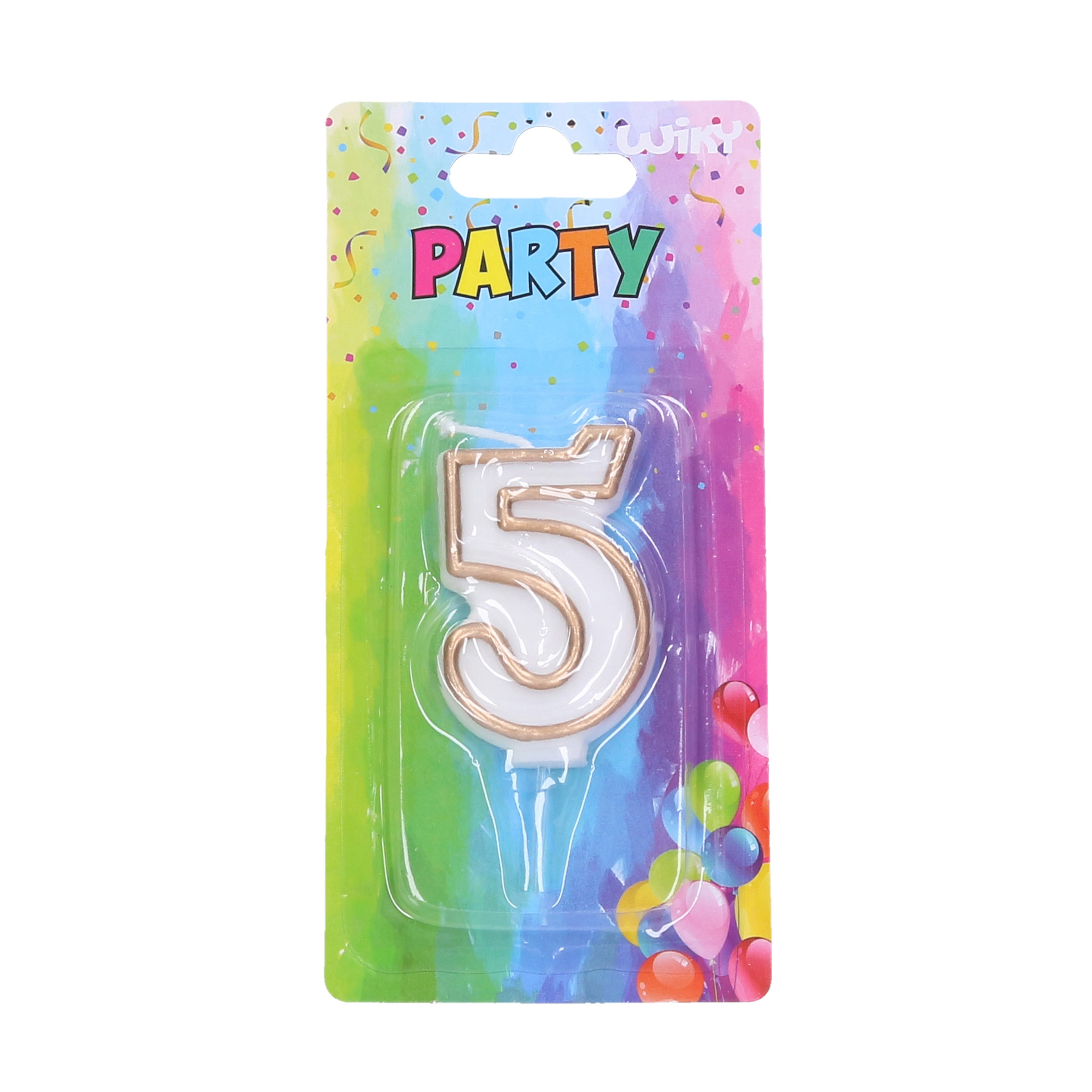 Bílá svíčka se zlatým lemem ve tvaru čísla se stojánkem z vosku pro pohodlné a pevné umístění na dort.