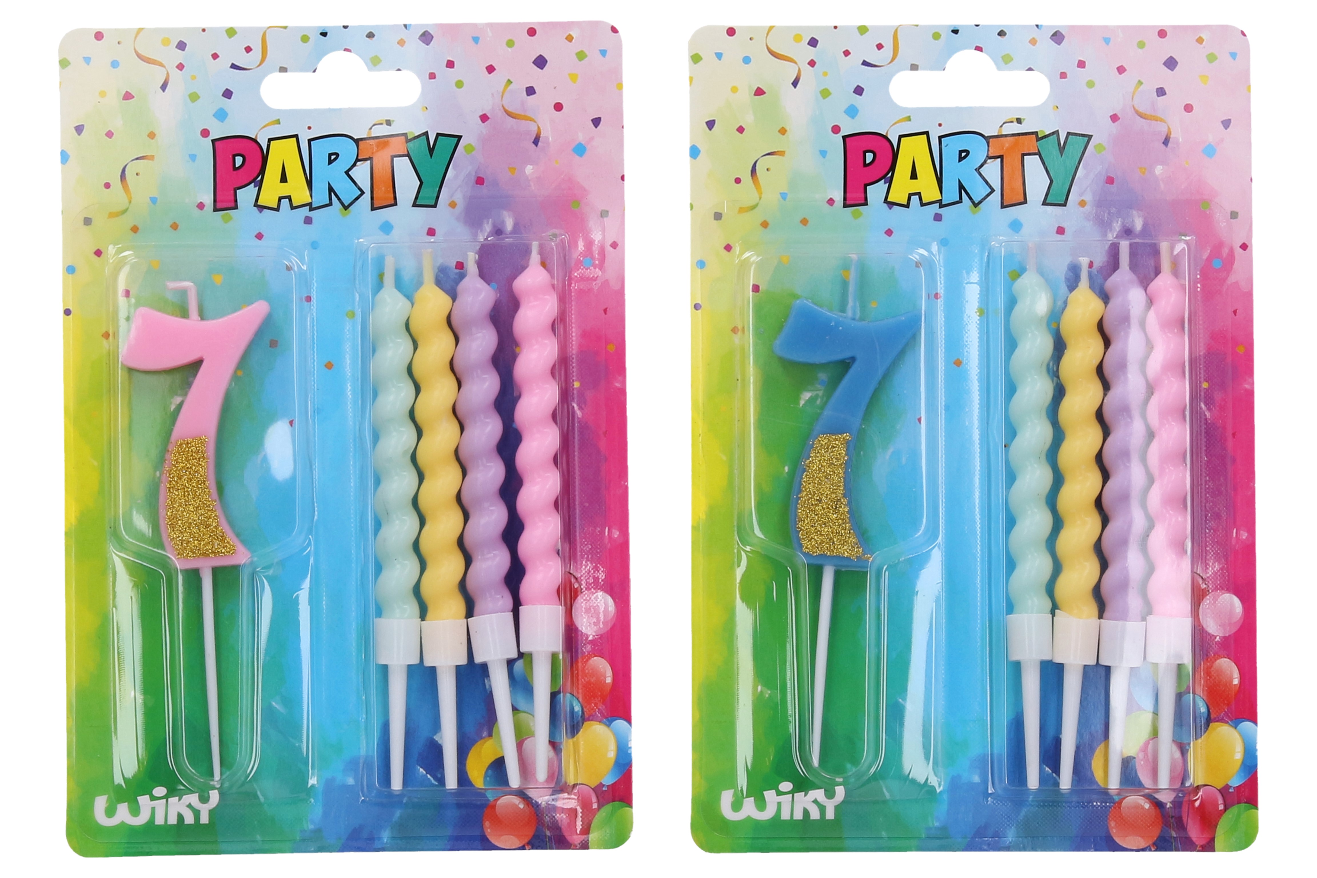 Párty svíčka číslo 7 + 4ks svíček. 2 barevné varianty - modrá, růžová.