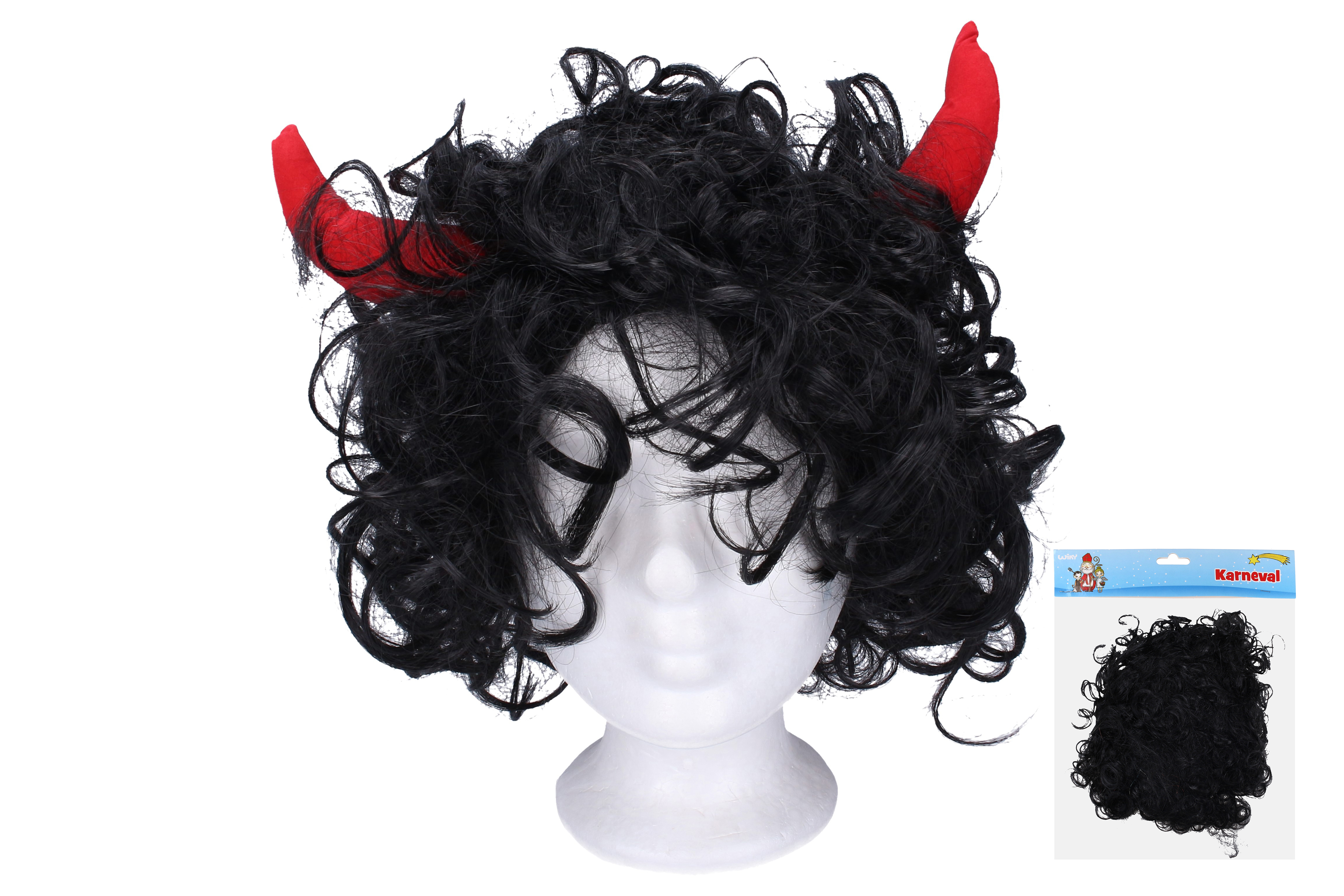 Paruká má černé vlasy a je dekorována čertími červenými růžky.