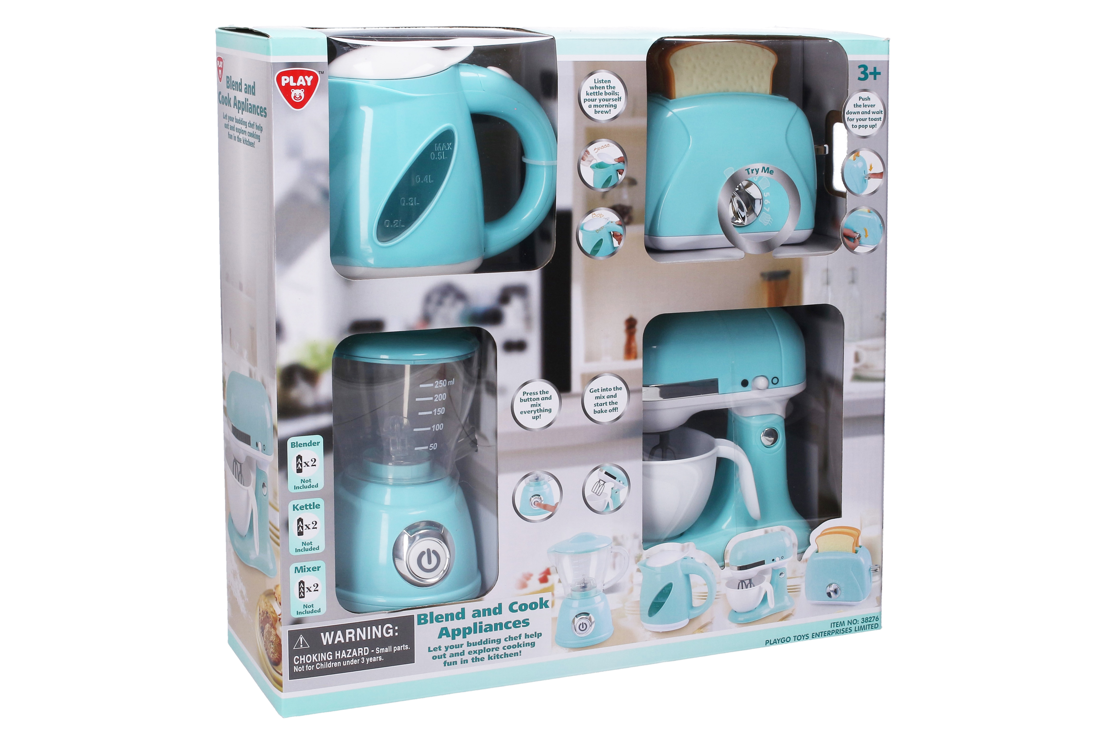 Playgo kuchyňské spotřebiče set 4ks. Obsahuje: varnou konvici, topinkovač, mixér a kuchyňský robot. Topinkovač po zatlačení páčky dolů a nastavení kolečka začne tikat a po uplynutí času topinky vyskočí. Mixér při držení stlačeného tlačítka mixuje. Kuchyňský robot po zapnutí tlačítka mixuje, po vypnutí se zastaví. Konvice vydává zvuk vařící se vody. Baterie 2xAAA (kuchyňský robot), 2xAA (mixér) a 2xAA (konvice). Baterie nejsou součástí balení.