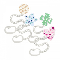 Veselý, barevný řetízek na dudlík NUK, je skvělým pomocníkem pro miminka i rodiče. Nenahraditelný zvláště během cestování a procházek. Díky sponě dudlík nespadne na zem a nezašpiní se, a neztratí se. Má jednoduché použití a je vyroben tak, aby se dal připnout k dětskému oblečení. Pestré barvy a veselé obrázky dítě zaujmou. Určeno pro děti od prvních dnů života. Vhodný pro šidítka s kroužkem.