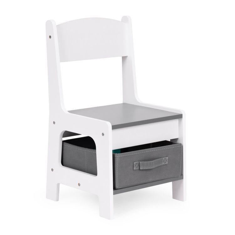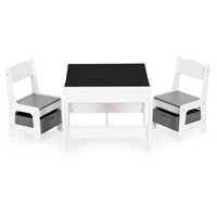 Součástí sady jsou 2 židle a stůl. Nábytek má odolnou a stabilní konstrukci z MDF. Stůl je vybaven oboustrannou, odnímatelnou deskou, z nichž jedna strana slouží jako tabule na křídu. Pod deskou se nachází praktický úložný prostor na kostky, hračky nebo jiné drobnosti. Pod sedáky židlí jsou umístěny prostorné textilní zásuvky vhodné pro ukládání hraček. Sada je ideální do dětského pokoje, heren nebo čekáren.