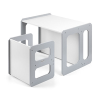 Sada nábytku 3v1 Stella v barevné kombinaci bílé a šedé se šedými doplňky, navržená s ohledem na zajištění dětem: pohodlí, prostoru pro kreativní hraní, malování, psaní a maximálního komfortu během činností.
