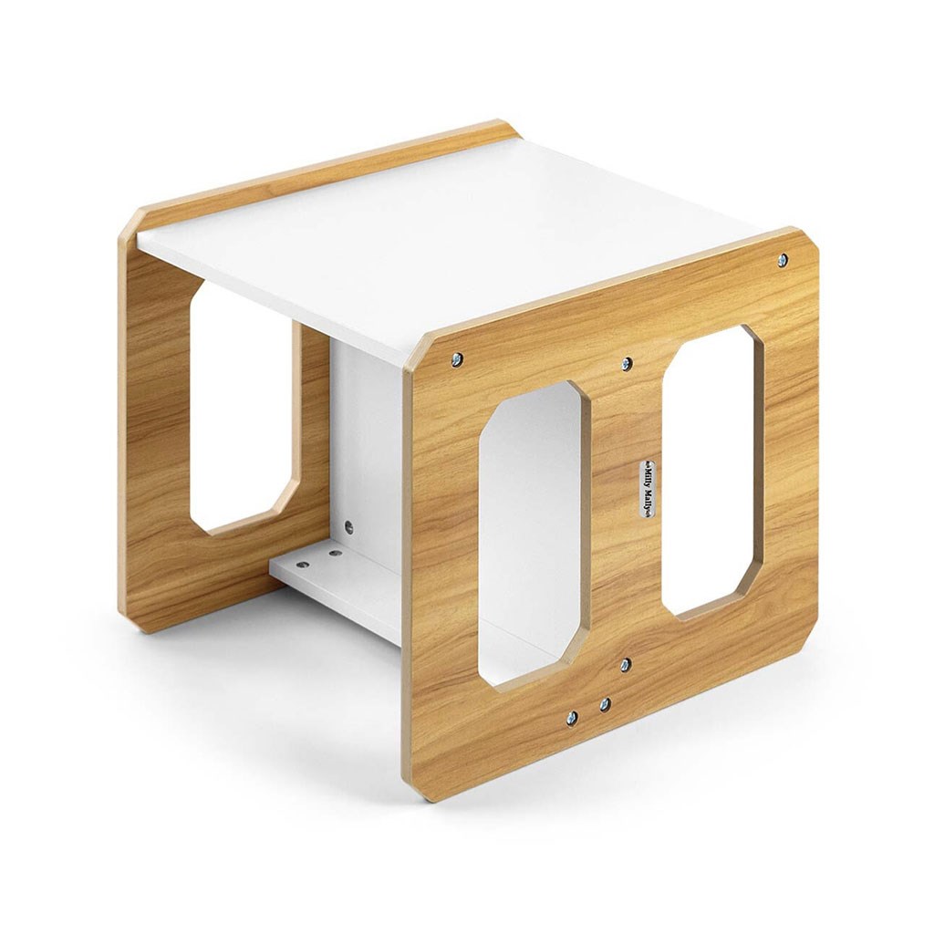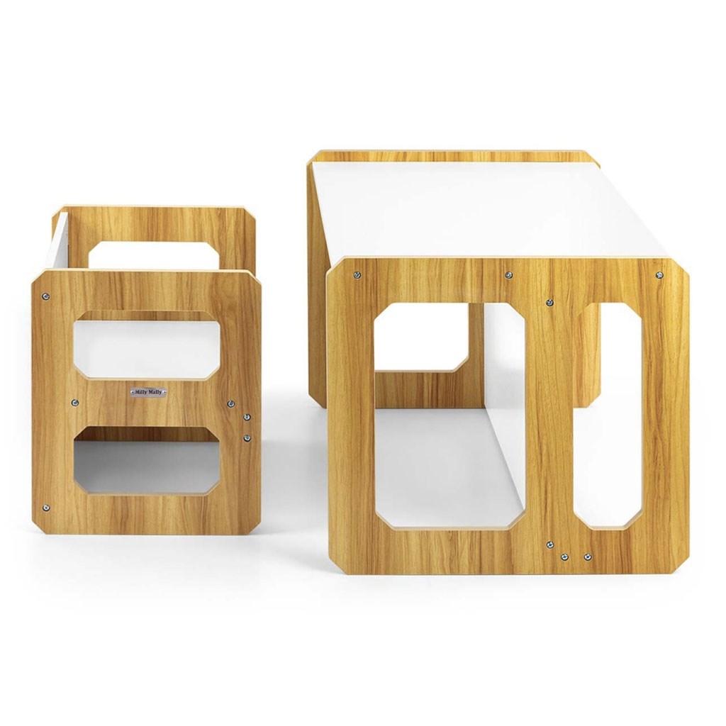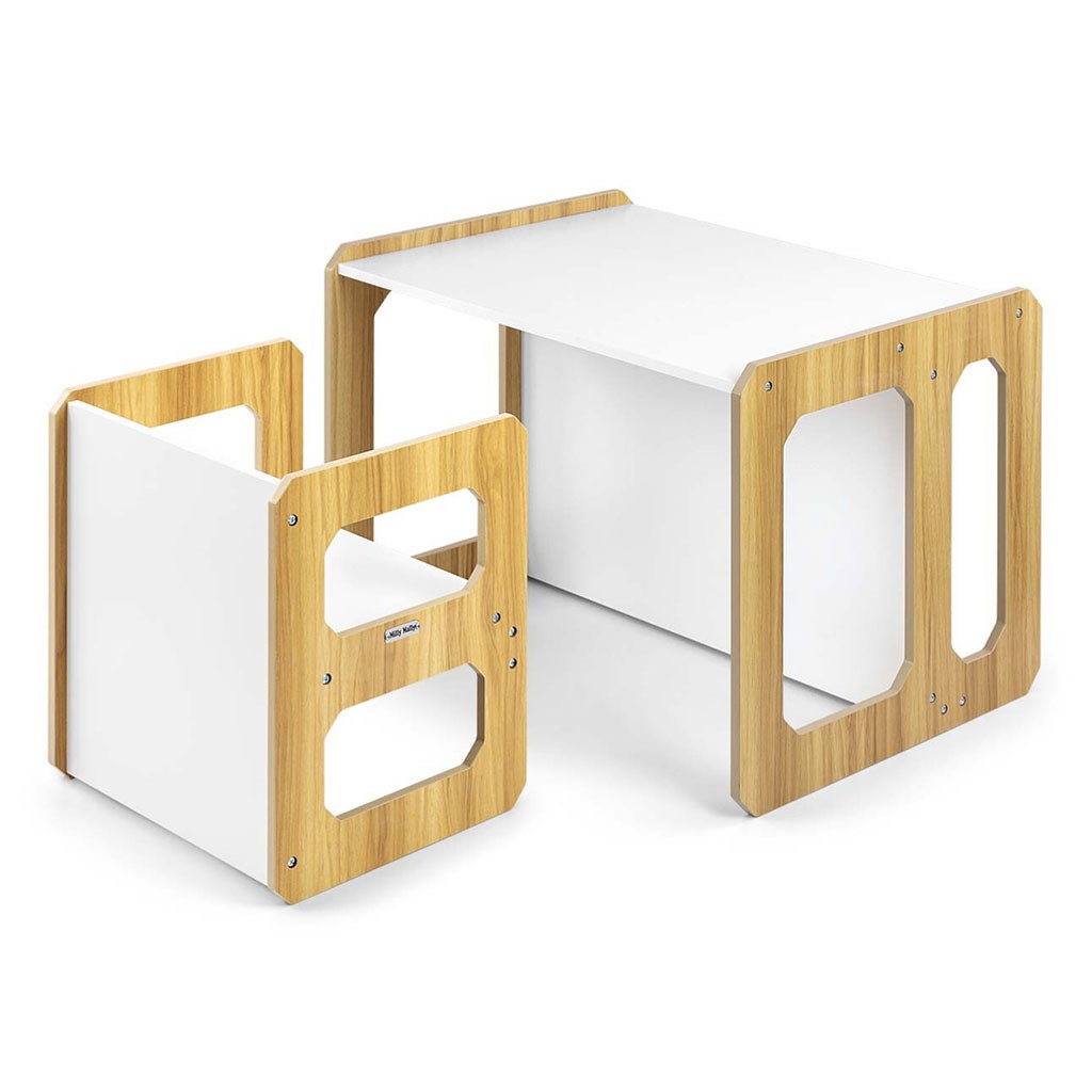 Sada se skládá z jednoho stolku a jedné židličky, které díky modulární konstrukci mohou plnit různé funkce – stolek lze proměnit ve větší sedadlo a židlička se dokonale hodí jako menší stolek nebo sedátko bez opěradla pro starší dítě. Díky své lehké konstrukci je tento nábytek snadno přenosný, což umožňuje dětem přizpůsobit si ho podle svých potřeb.