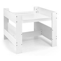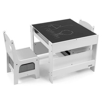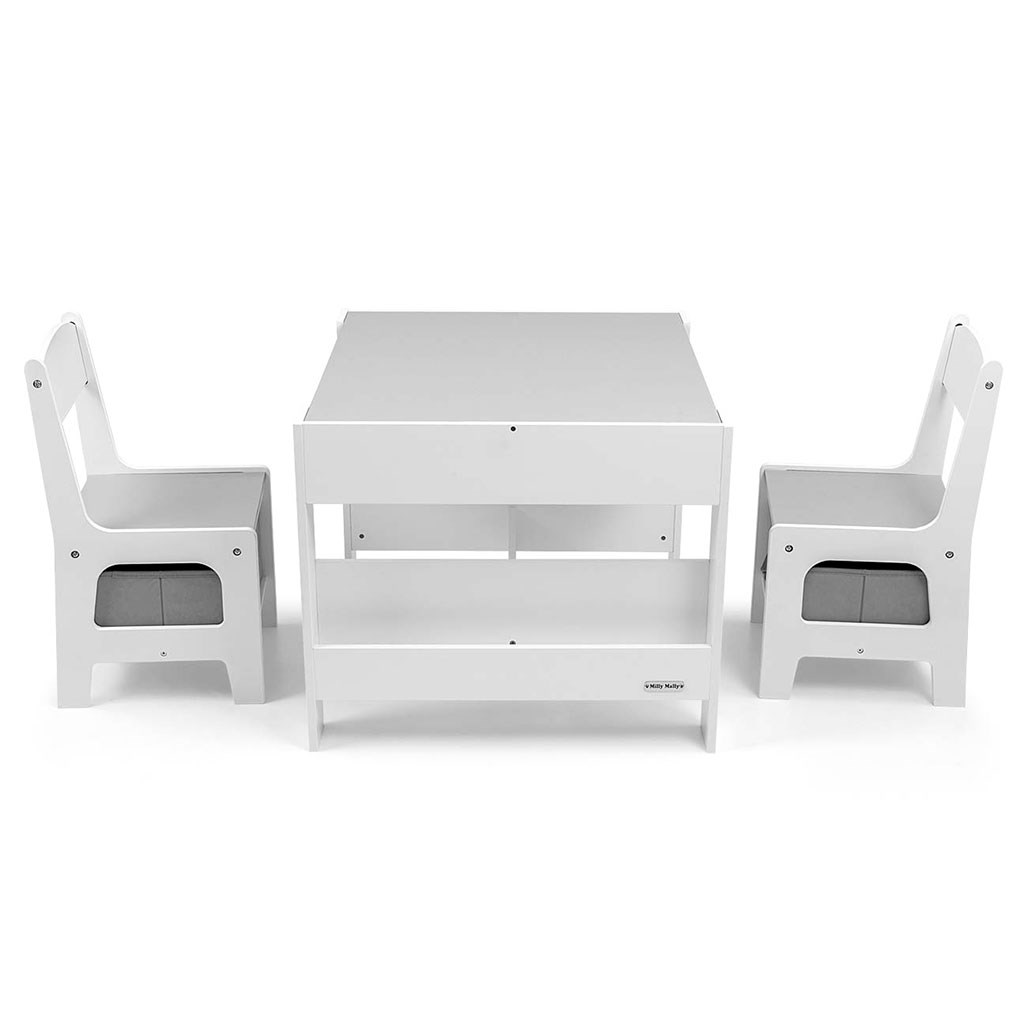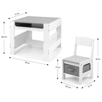 Multifunkční sada nábytku pro děti. Stůl SVEN se 2 židlemi v bílé a šedé barvě s šedými doplňky je vyroben tak, aby dětem poskytoval: pohodlí, prostor pro kreativní hru, malování, psaní a maximální komfort při činnostech. Sada obsahuje 2 židle se 2 látkovými úložnými pomůckami zasunutými do police pod židlemi. Stůl je vybaven obrovským úložným prostorem umístěným pod oboustrannou odnímatelnou deskou. Má také boční úložné police. Na jedné straně desky stolu je velká kreslicí deska. Židle jsou lehké a děti s nimi mohou volně pohybovat. Nábytek je vyroben s výjimečnou precizností a pečlivostí. Obě židle mají zaoblené rohy, které chrání dítě před zraněním. Všechny prvky konstrukce stolu a židlí zajišťují vysokou stabilitu a minimalizují riziko pádu. Souprava Sven vyrobená z MDF je odolná a snadno se udržuje. Sada nábytku se snadno sestavuje a všechny součásti potřebné k montáži jsou součástí balení.