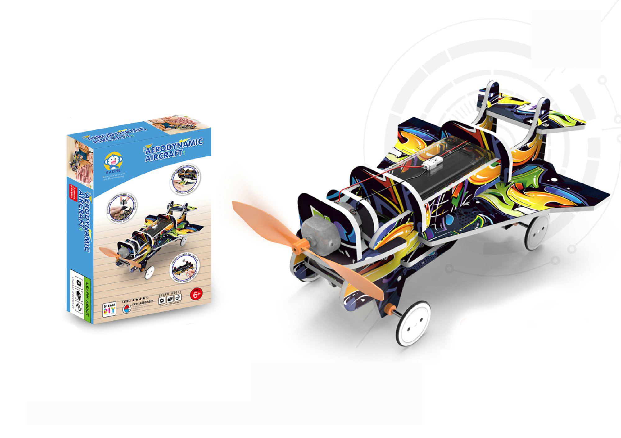 Stavebnice letadlo. 2xAA baterie není součástí. Tlačítko (přepínač) ON/OFF.