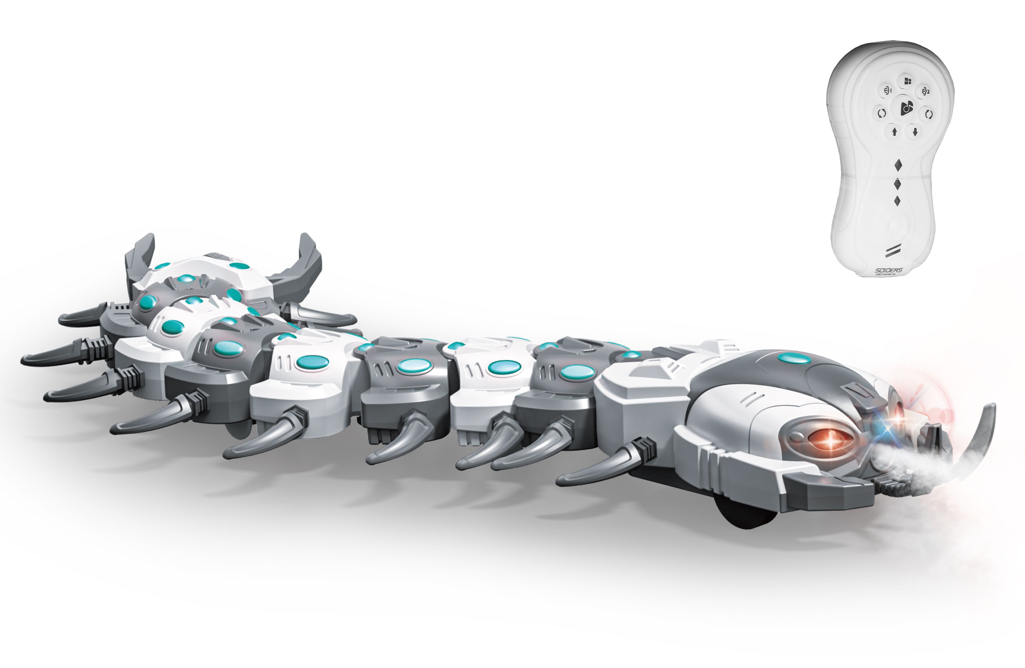Stonožka kouřící RC na dálkové ovládání. Rozměry 53x15x5 cm. Frekvence 2.4GHz. Světelné, zvukové a kouřové efekty. Tlačítka na ovladači - chůze dopředu a dozadu, otáčení vlevo a vpravo, 2 módy kouřových efektů, zvuk, demo režim. 3.7V bateriový pack do housenky součástí, 2xAA do ovladače nejsou součástí. Přepínač ON/OFF na spodní straně housenky. Nádržka na vodu na spodní straně hlavy. USB kabel, nádobka na vodu součástí.