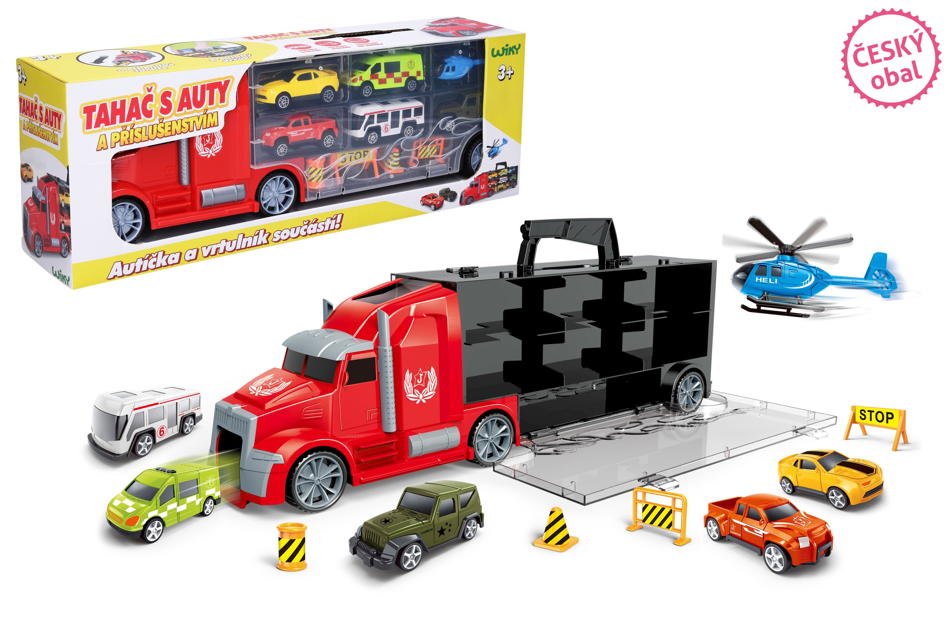Tahač s auty. Velikost tahače 42 cm. Volná kola. Součástí 5 autíček, 1 vrtulník. Autíčka mohou projíždět skrz kabinu podle obrázku na obalu. Přívěs má zásobník na autíčka z obou stran. Vysunovací držadlo na vrchní části přívěsu pro snadné přenášení.