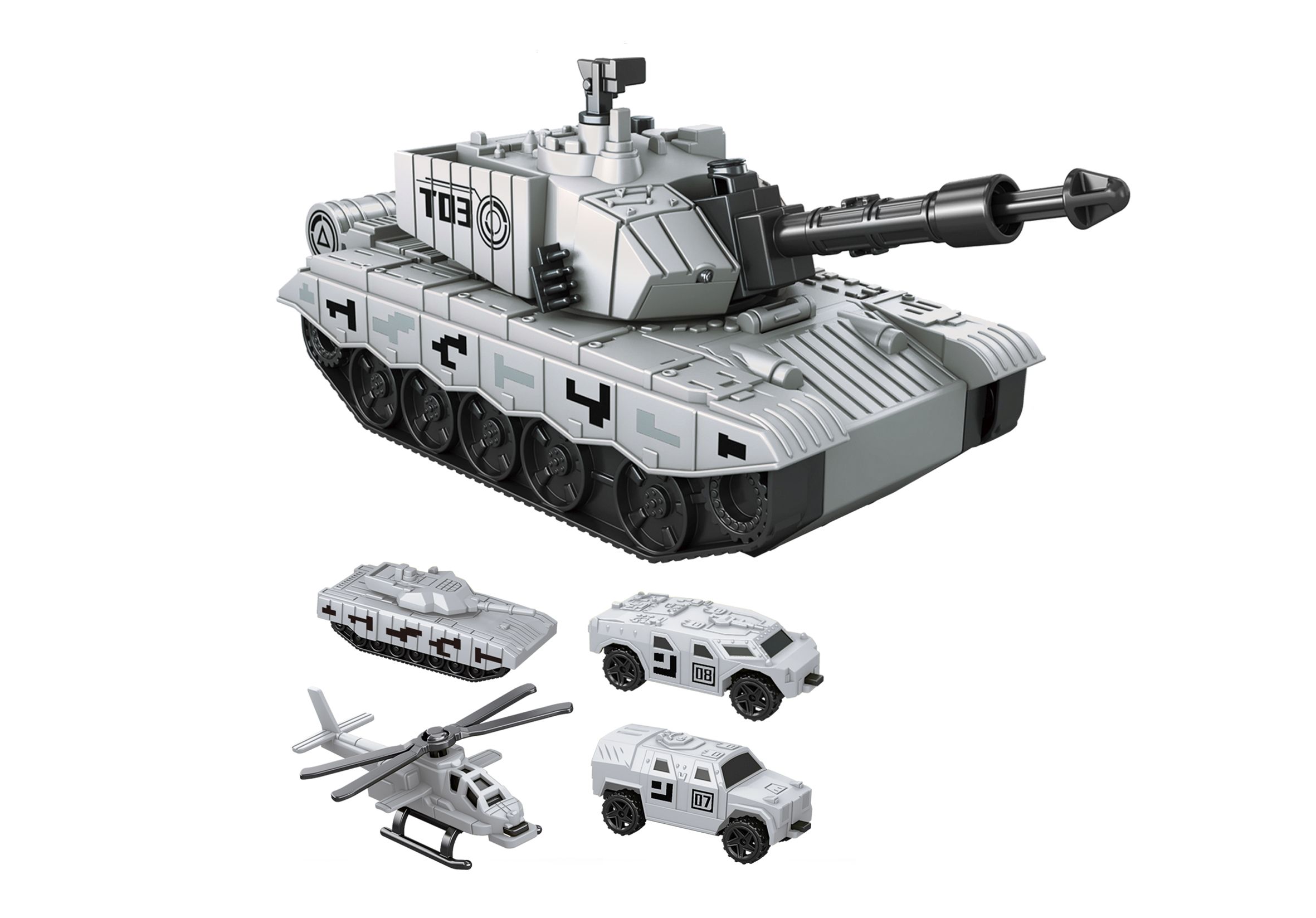 Tank na setrvačník vystřelovací. Velikost 21 cm. Vystřelování šipek - šipku zasuňte do kanónu tanku, tlačítkem na kanónu vystřelíte. Vystřelovací garáž na auta v přední části tanku - odklopte dvířka, vložte autíčko, velkým tlačítkem v zadní části tanku vystřelíte. Obsah balení - tank 21 cm, 3x vojenské auto 7 cm volná kola, vrtulník 8 cm, 8 šipek do tanku. Obrázkový návod na obalu.