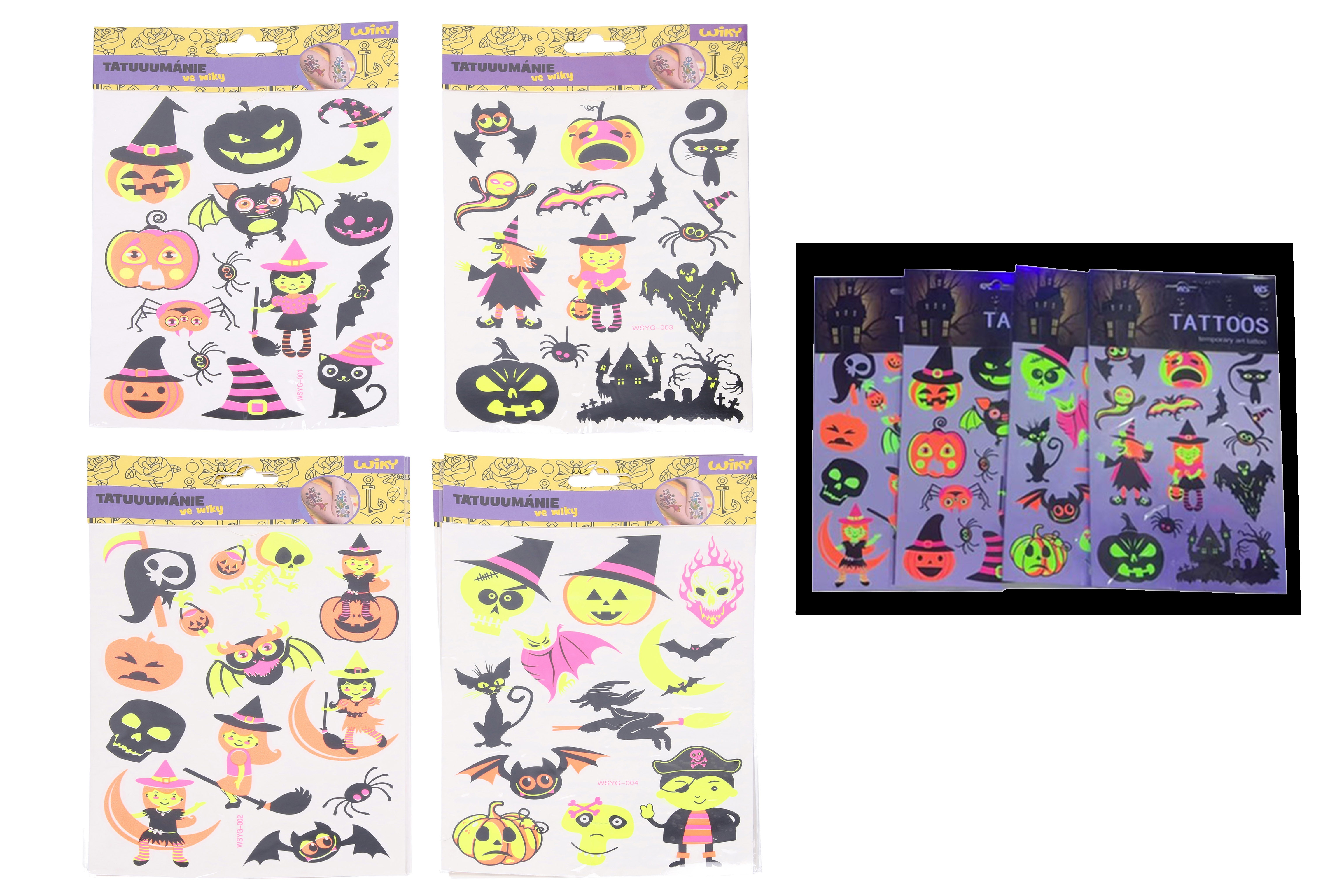 Tetovací obtisky v motivu Halloween o velikosti 16,5x22 cm. Fluorescenční obtisky, svítí pod UV zářením. 4 varianty.