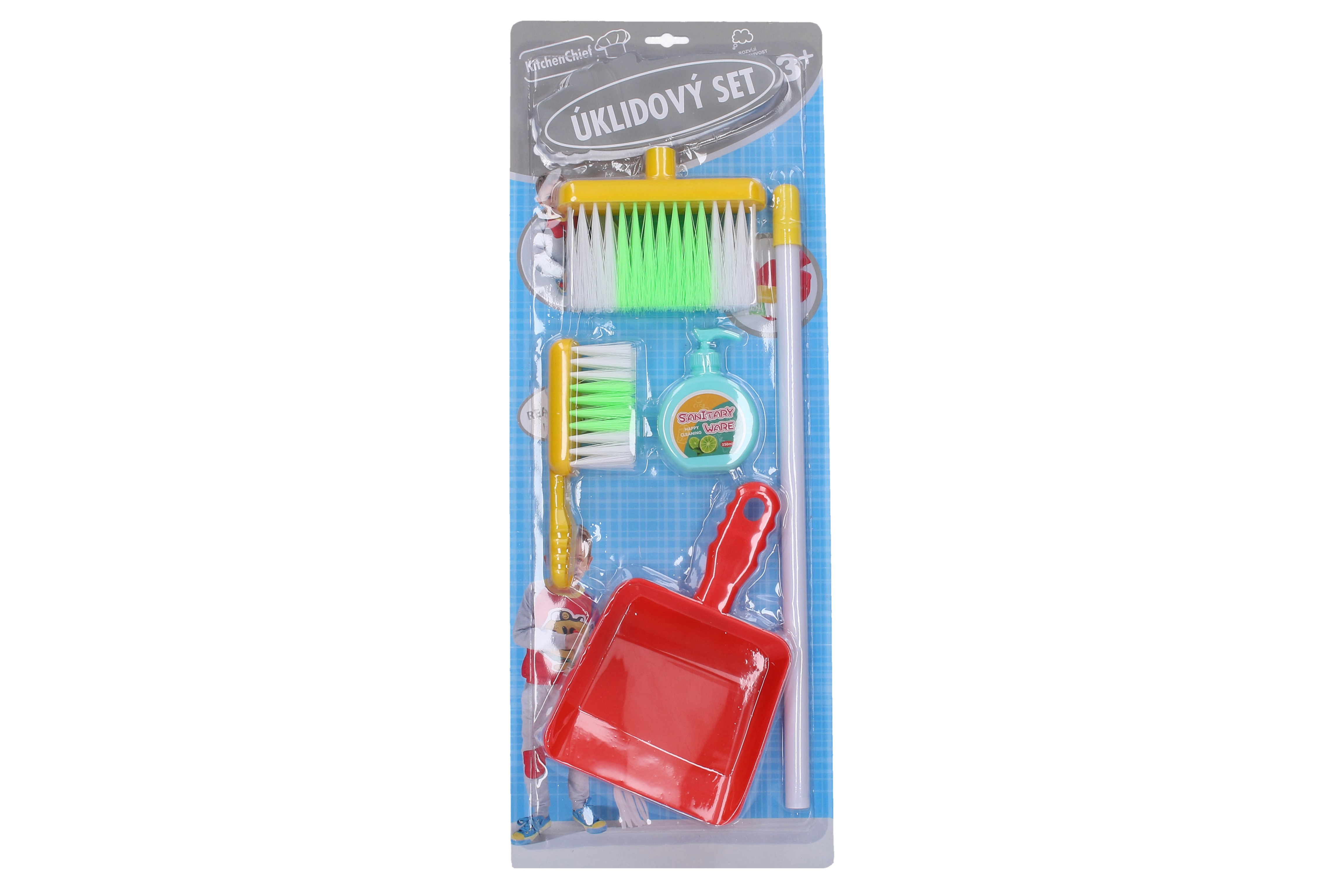Úklidový set. 4 ks - lopatka 22 cm, smeták 51 cm, smetáček 16,5 cm, čistící prostředek 10 cm.