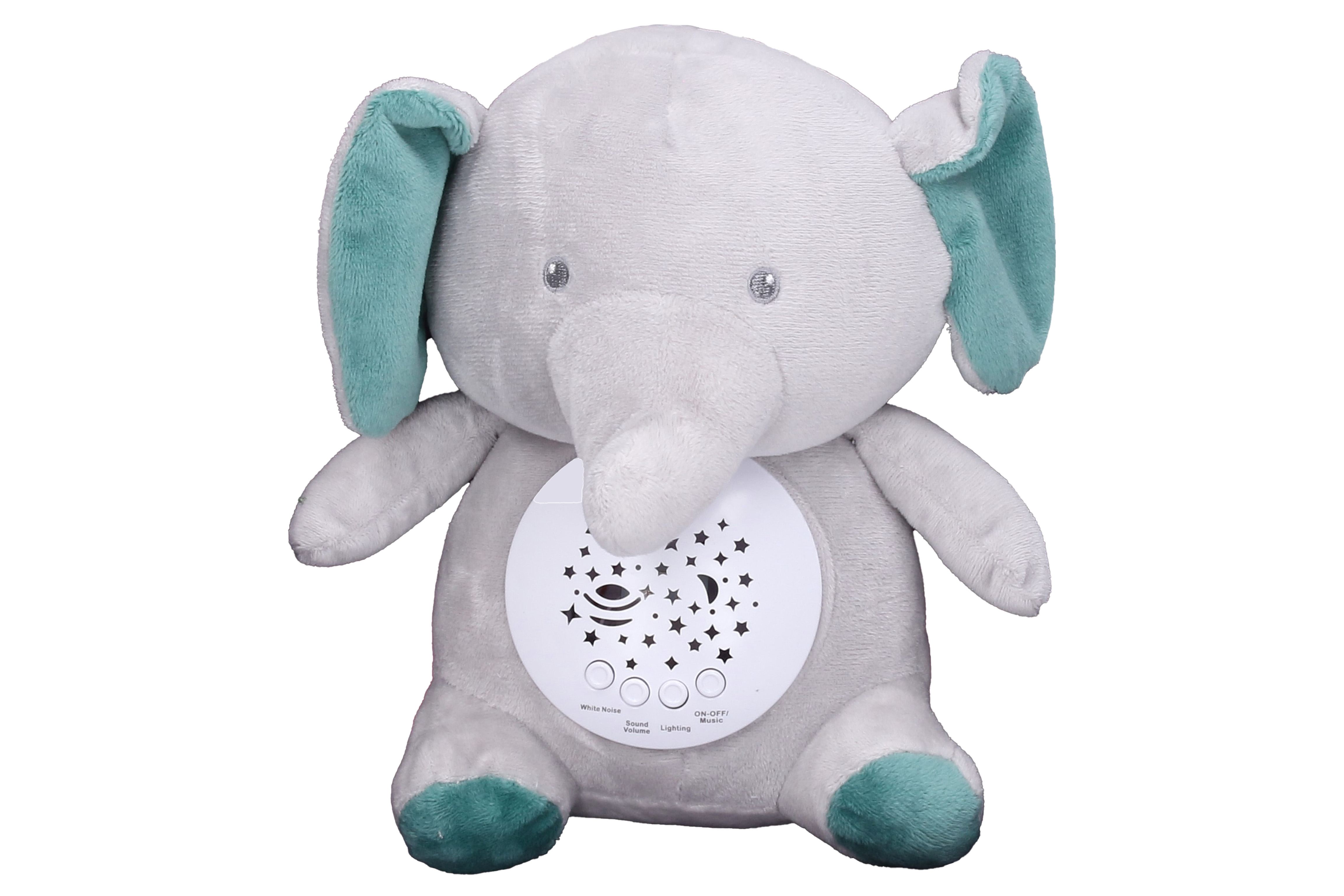 Usínací slon plyšový. Rozměry 26x12x25 cm. Funkce světla - 7 barev, mohou se automaticky měnit. 10 melodií, 4 bílý šum. Možnost nastavení hlasitosti. Automatické vypnutí po 30 minutách. 3xAAA baterie, nejsou součástí.