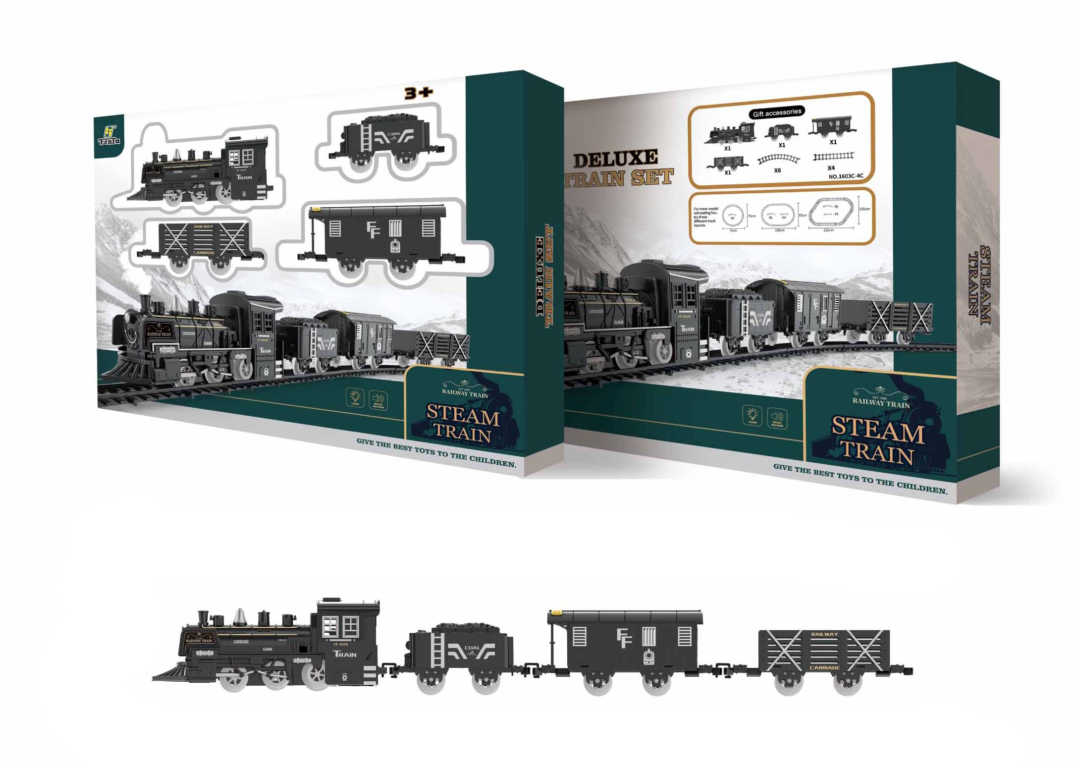 Vlak set. Rozměry železnice 135x75 cm, velikost mašinky 20 cm, vagónů 10-15 cm. Možnost složit 3 různé tratě. Světelné, zvukové a kouřové efekty. 4xAA baterie ze spodní strany mašinky nejsou součástí. Přepínač ON/OFF na levém boku mašinky. Obsahuje, mašinku, 3 vagóny, 4 rovné kolejnice, 6 zahnutých kolejnic, nádobku na vodu. Nádržka na vodu pod stříbrným komínkem.