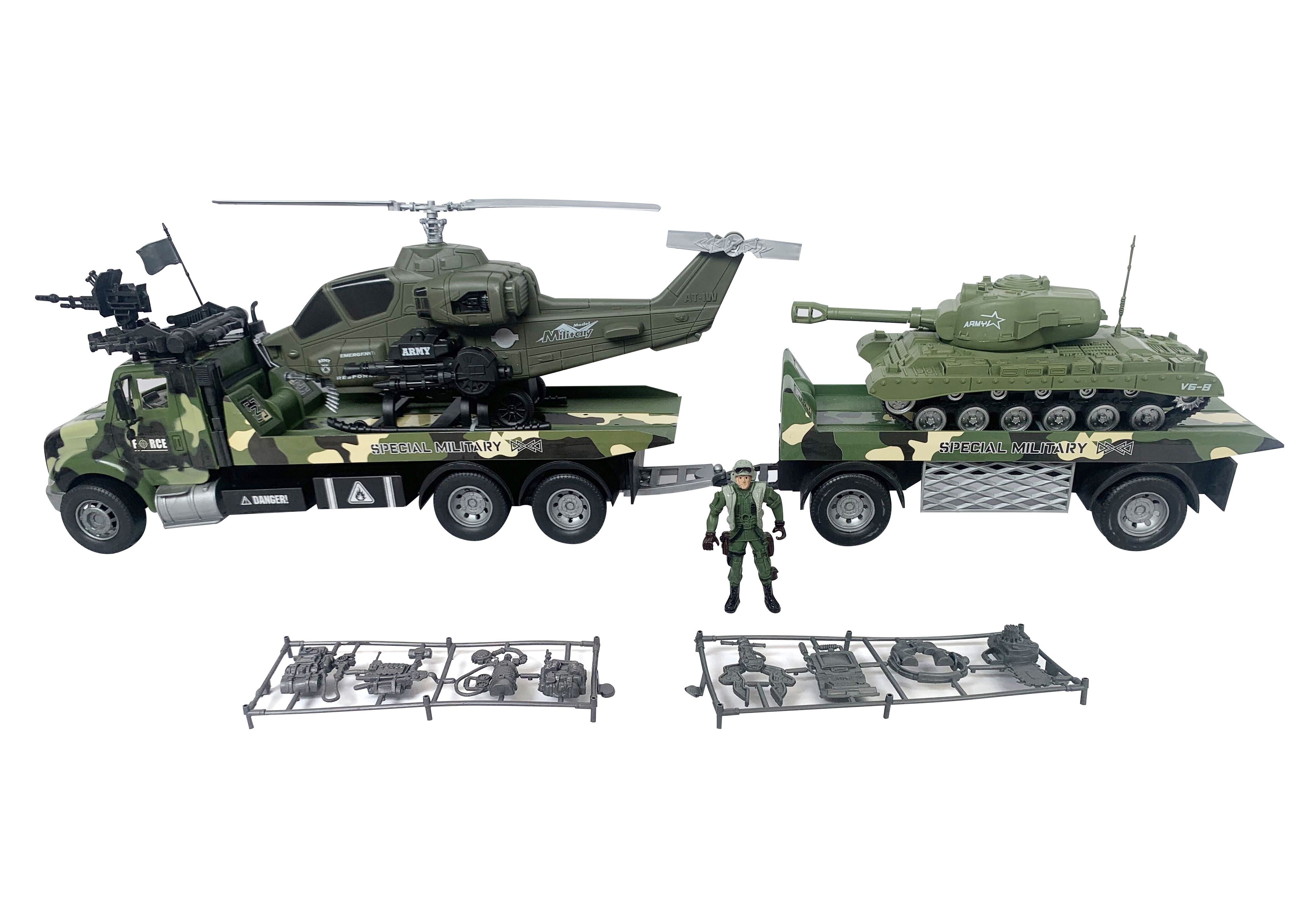 Vojenský tahač s vojákem. Velikost tahače 80cm. Obsahuje tahač, vrtulník, tank, figurku vojáka, příslušenství pro vojáka.