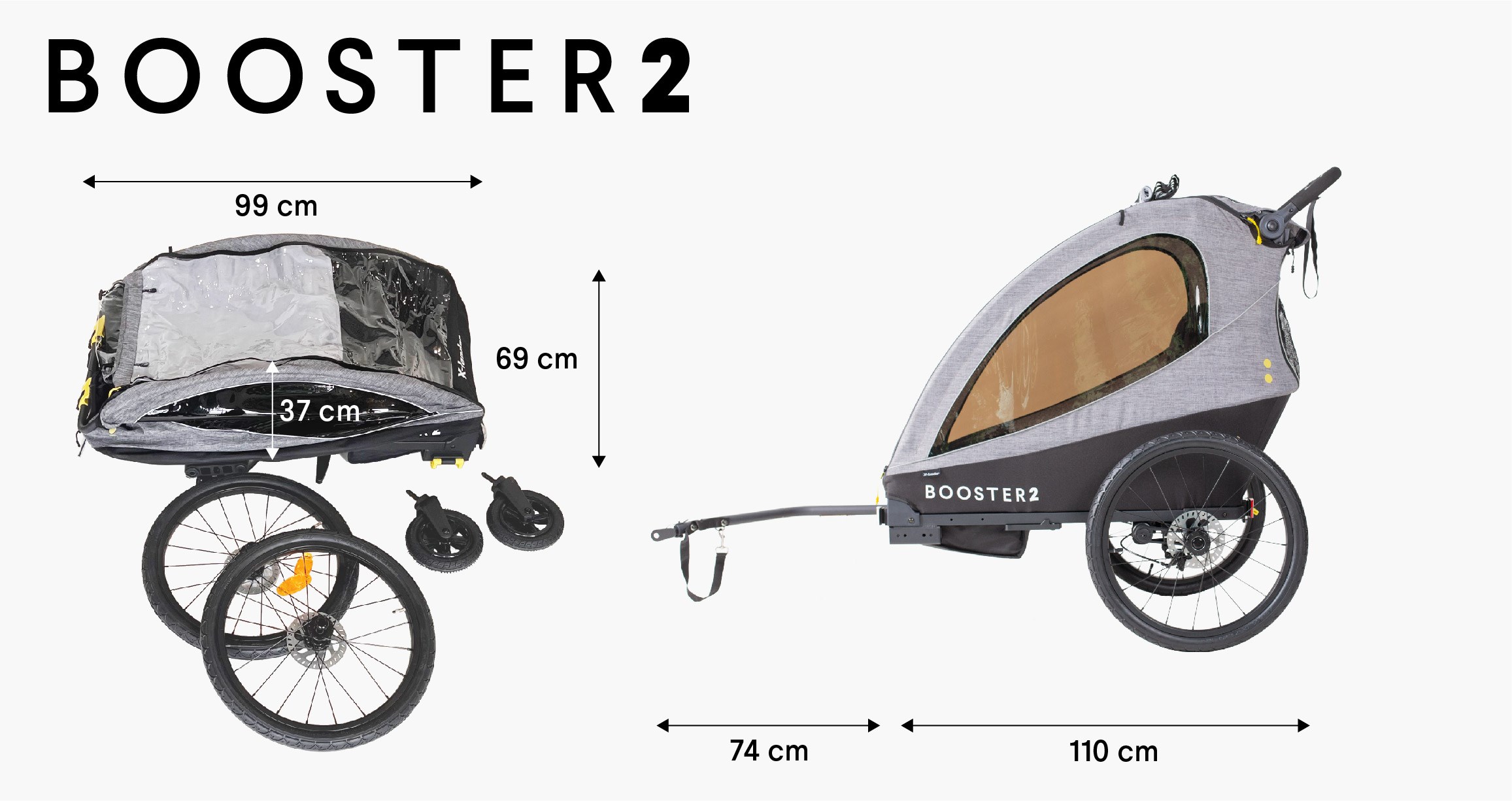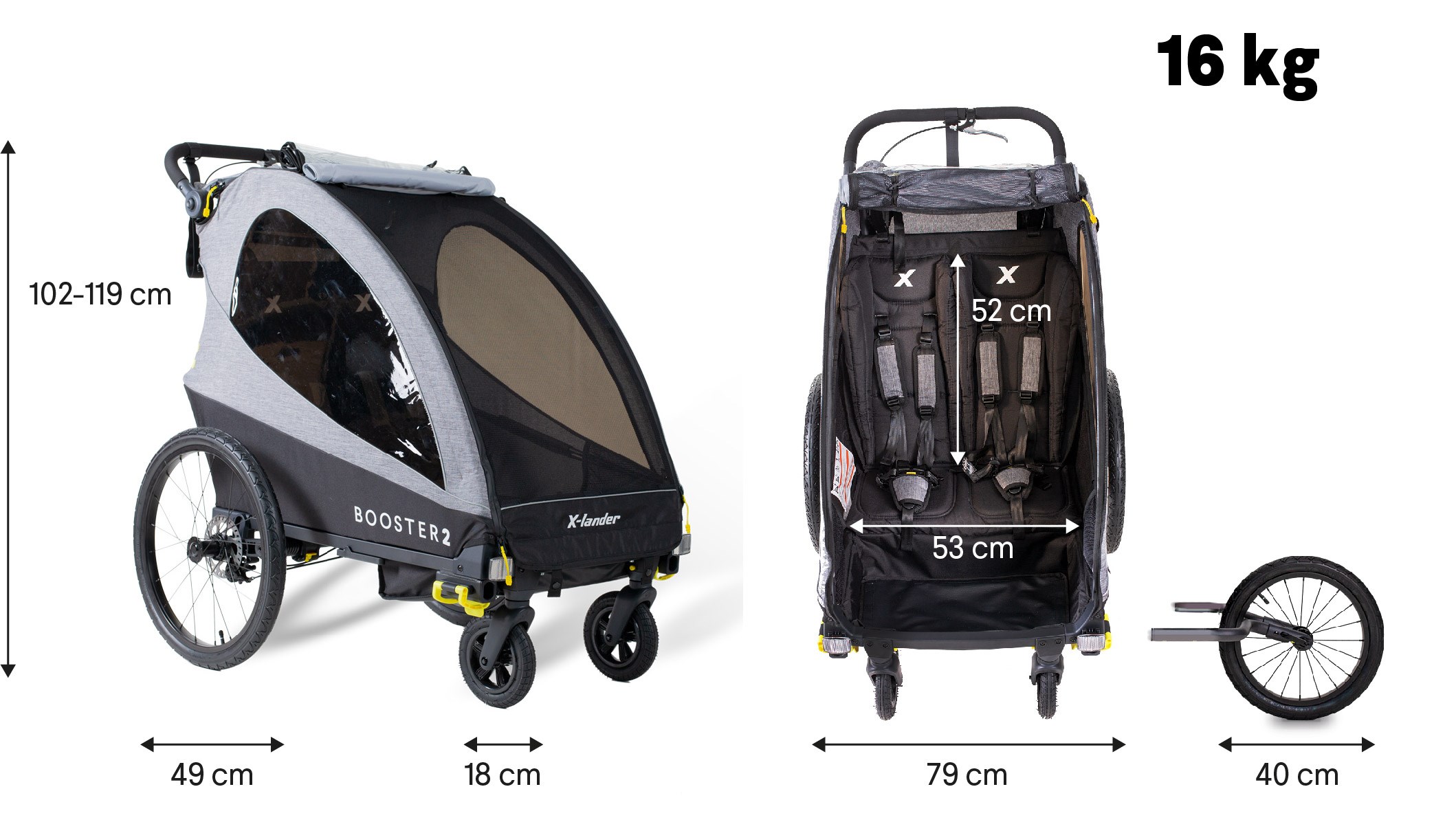 X-lander Booster 2 je multifunkční výrobek vytvořený pro aktivní rodiče, kteří chtějí co nejefektivněji trávit čas se svými dětmi venku. Umožňuje využít jeden kočárek více způsoby – procházky v nerovném lesním terénu, jogging nebo připojení vozíku k jízdnímu kolu pro dlouhé cyklostezky.