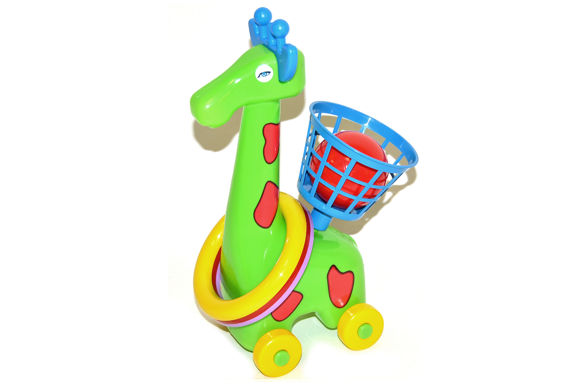 Žirafa házecí na kolečkách s kroužky a košíkem