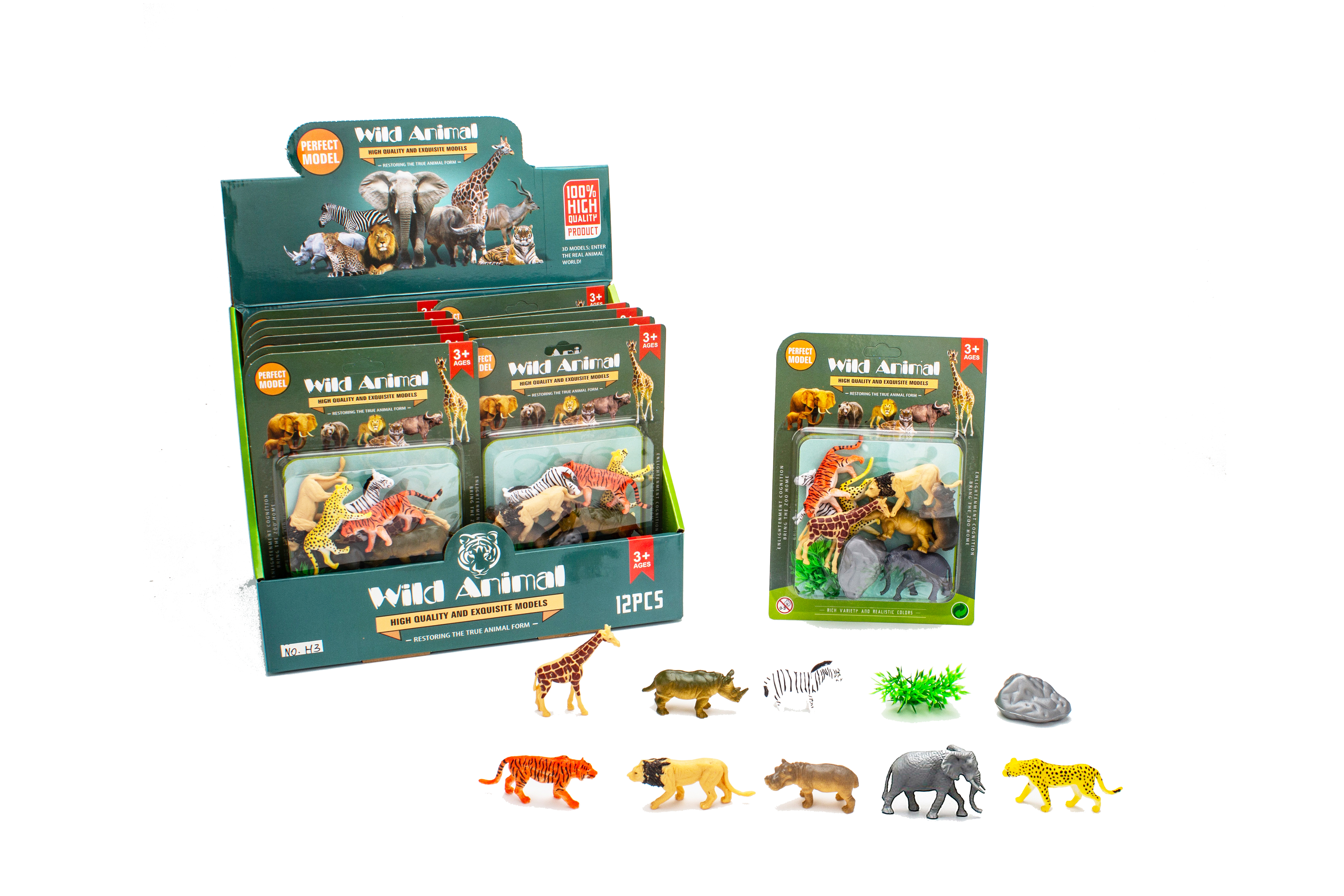 Zvířátka divoká figurky set. Rozměry figurek 6x4x1,5 cm. Obsah balení - 8 zvířátek, keř, kámen. Display box 12 ks.